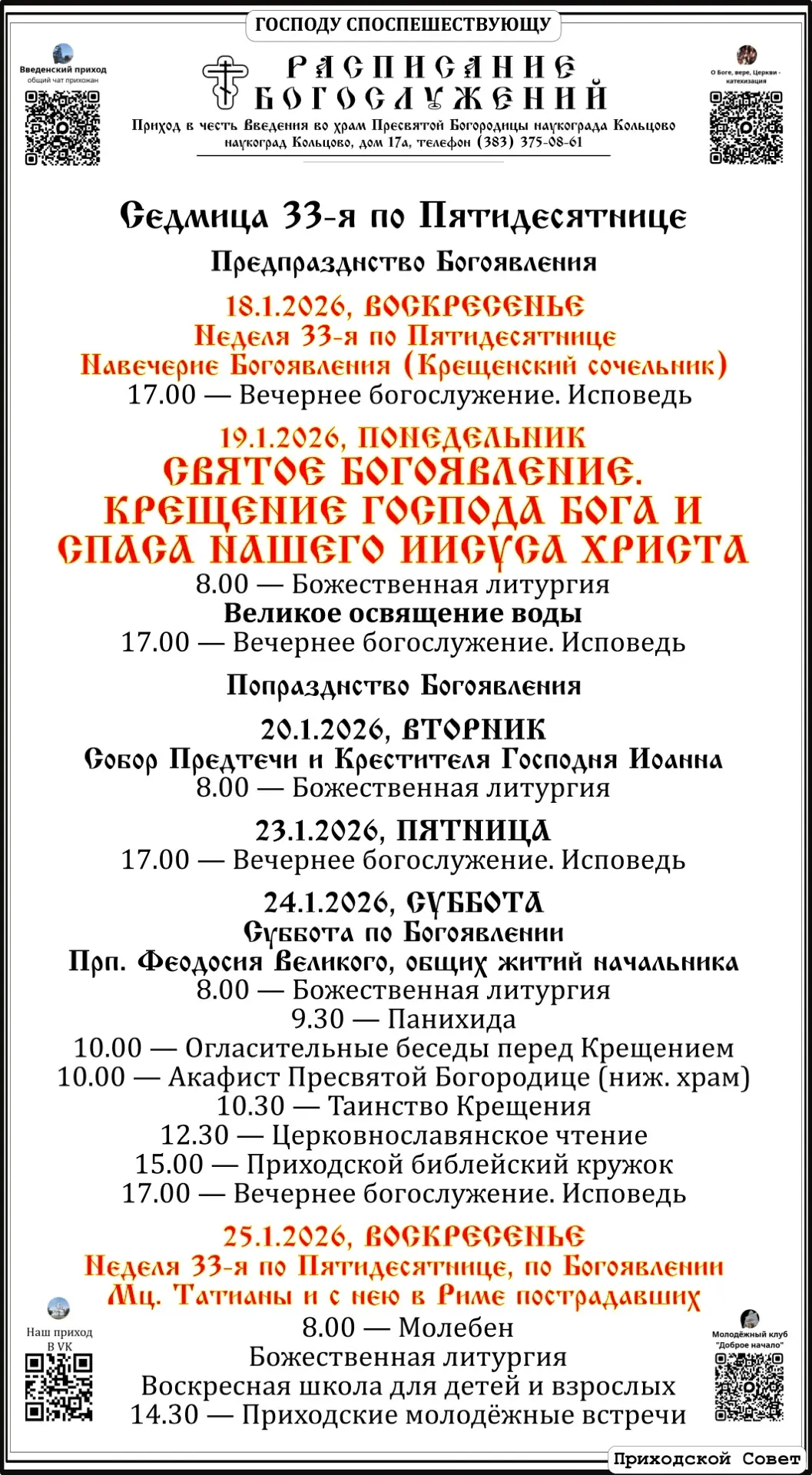 Расписание богослужений Введенского прихода наукограда Кольцово на крещенскую седмицу 19 - 25.1.2026 г.