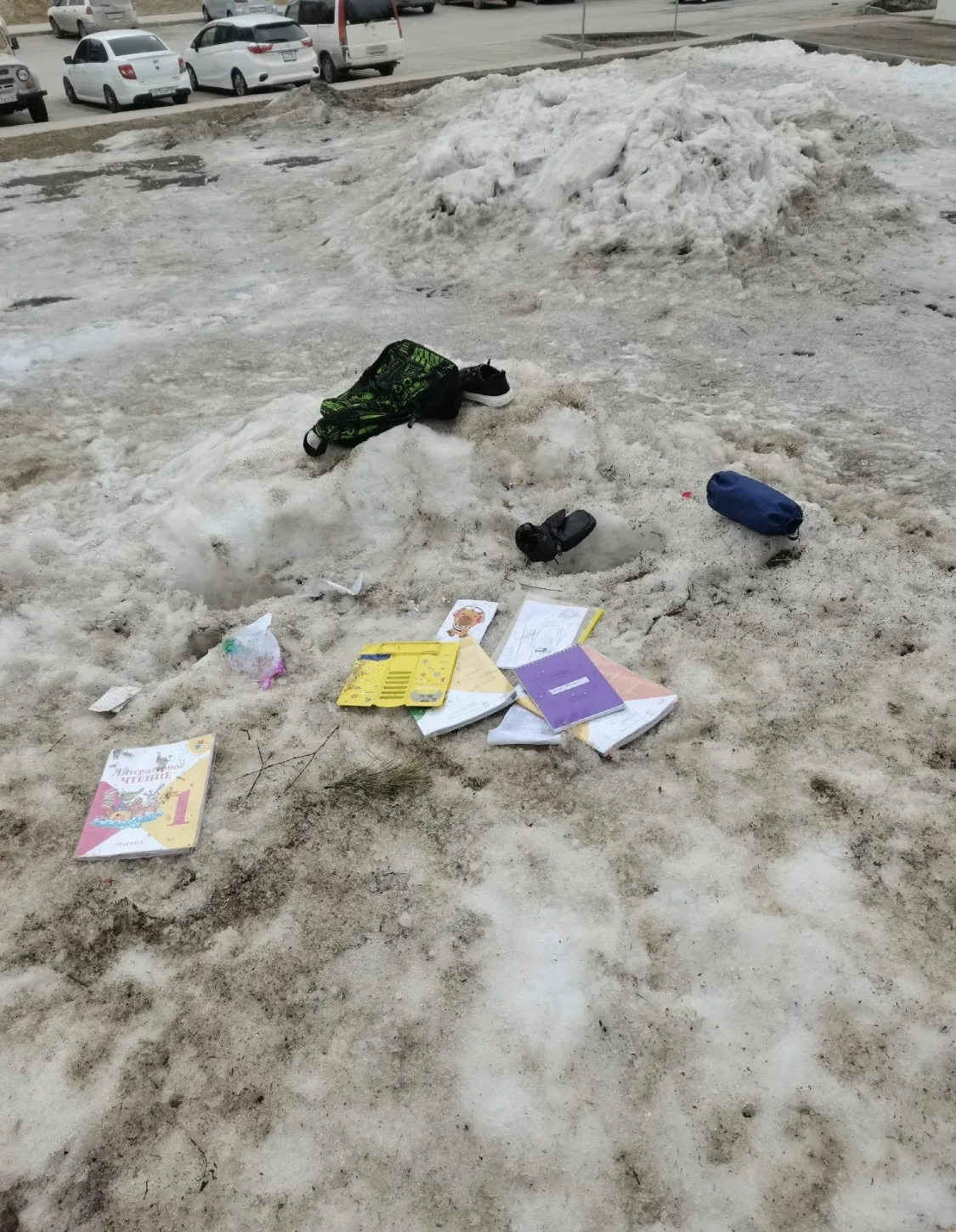 На бывшей горке ледового городка. учебники 1го класса. фамилию не видно. Предположительно Михаил.