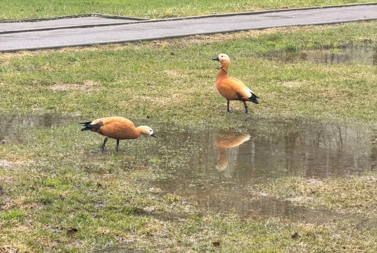 Вот такая красота 😻 была запечатлена в Апрелевке на детской площадке возле магазина 5 пятерочка )Огарь (красная утка, лат. Tadorna ferruginea) — птица семейства утиных)