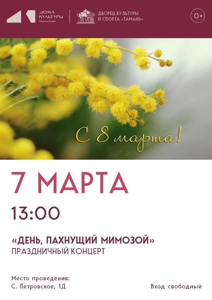 Приглашаем вас 7 марта в 13:00 в СП "Петровское" на праздничный концерт "День, пахнущий мимозой", посвящённый Международному женскому дню 8 марта.
