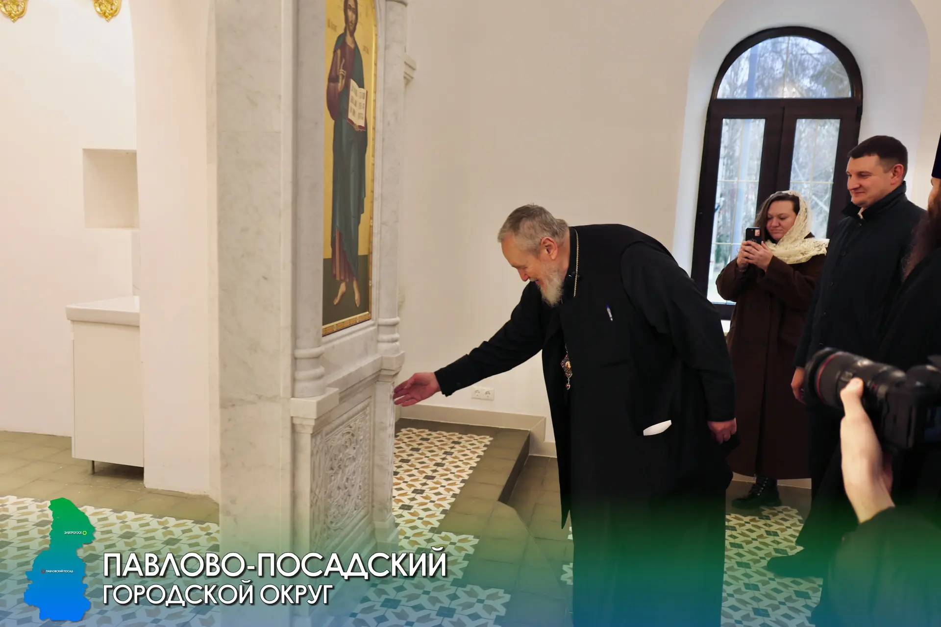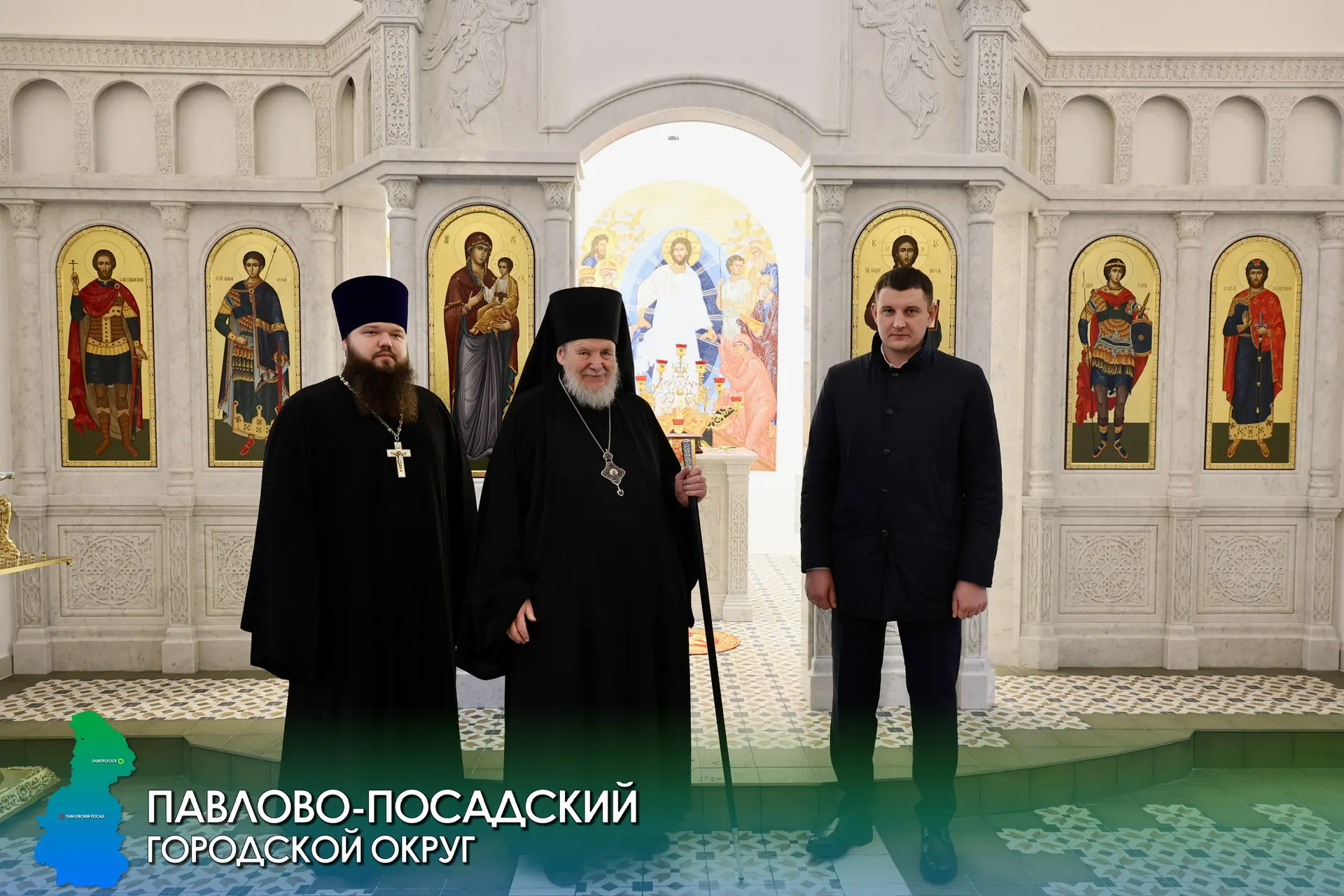 После Божественной литургии в Казанском храме, вместе с Благочинным Павлово-Посадского округа, священником Александром Анохиным и епископом Балашихинским и Орехово-Зуевским Николаем посетили строящийся Георгиевский храм у парка Победы на улице Фрунзе.