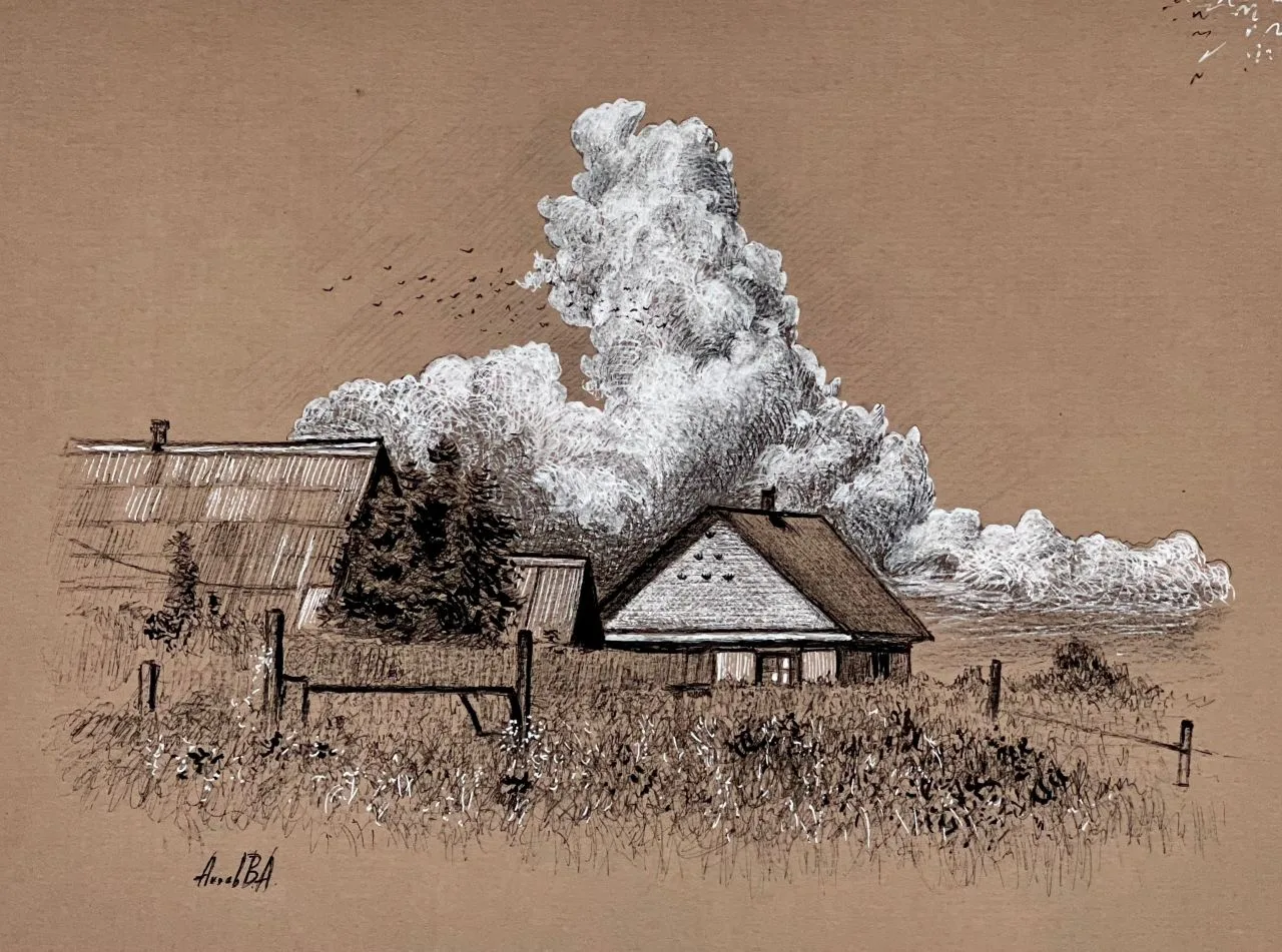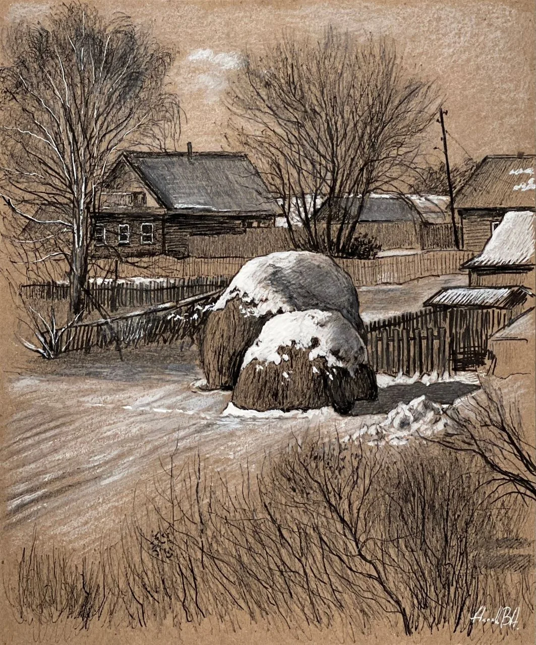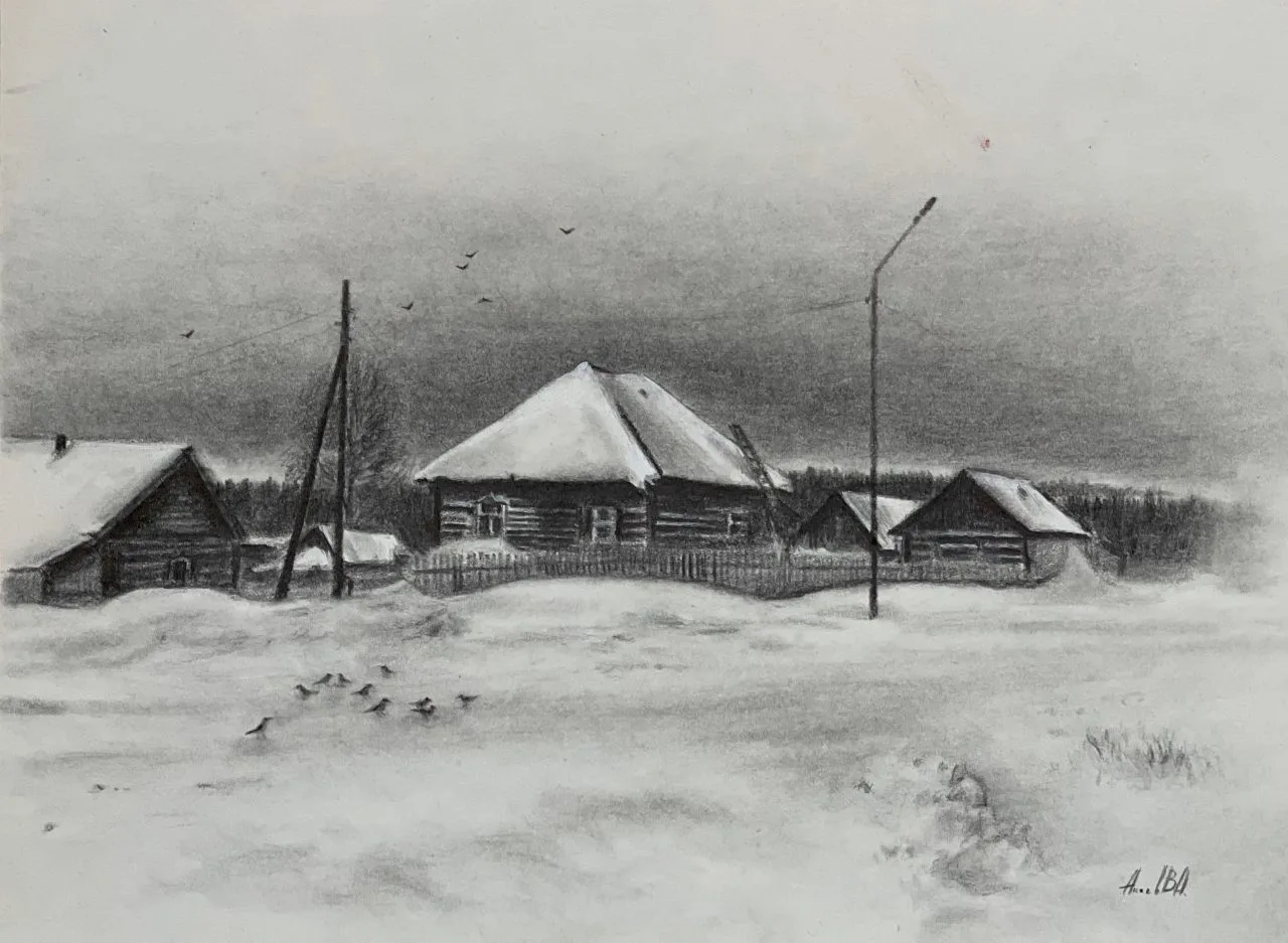В них запечатлены уютные деревенские домики и природа в предзимье. Автор виртуозно передаёт атмосферу тишины и умиротворения через контрасты чёрного и белого. Каждый штрих наполнен тонким чувством света и гармонии.