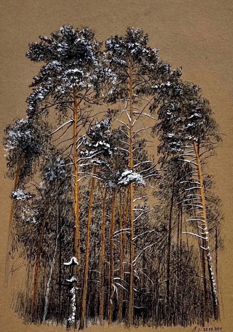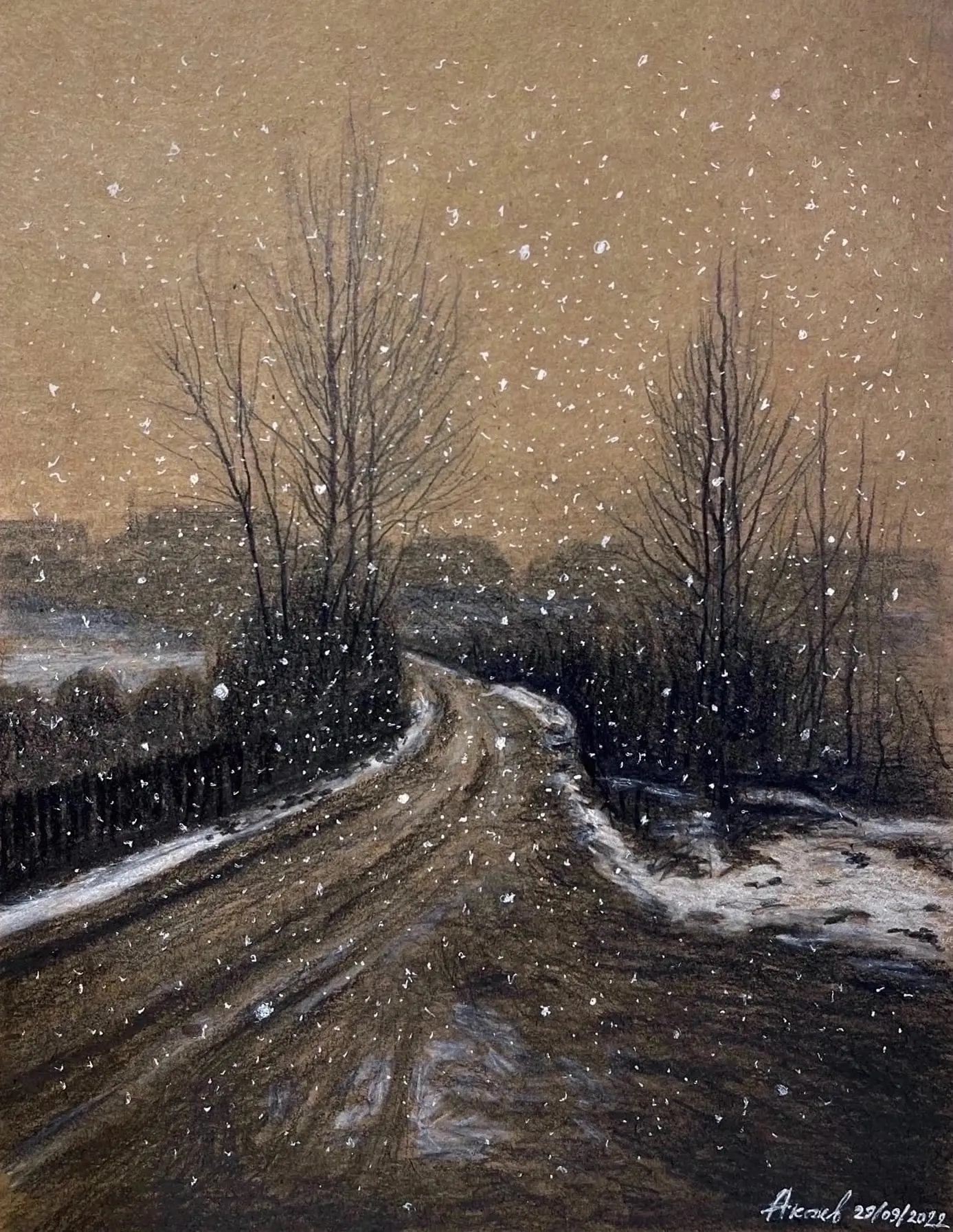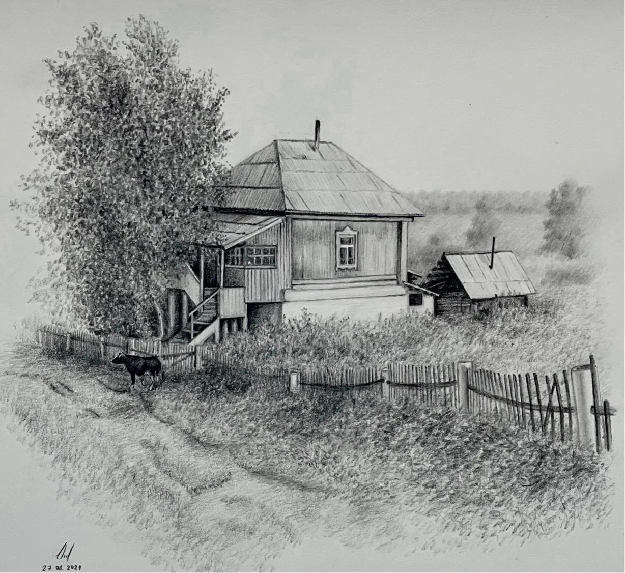 В них запечатлены уютные деревенские домики и природа в предзимье. Автор виртуозно передаёт атмосферу тишины и умиротворения через контрасты чёрного и белого. Каждый штрих наполнен тонким чувством света и гармонии.