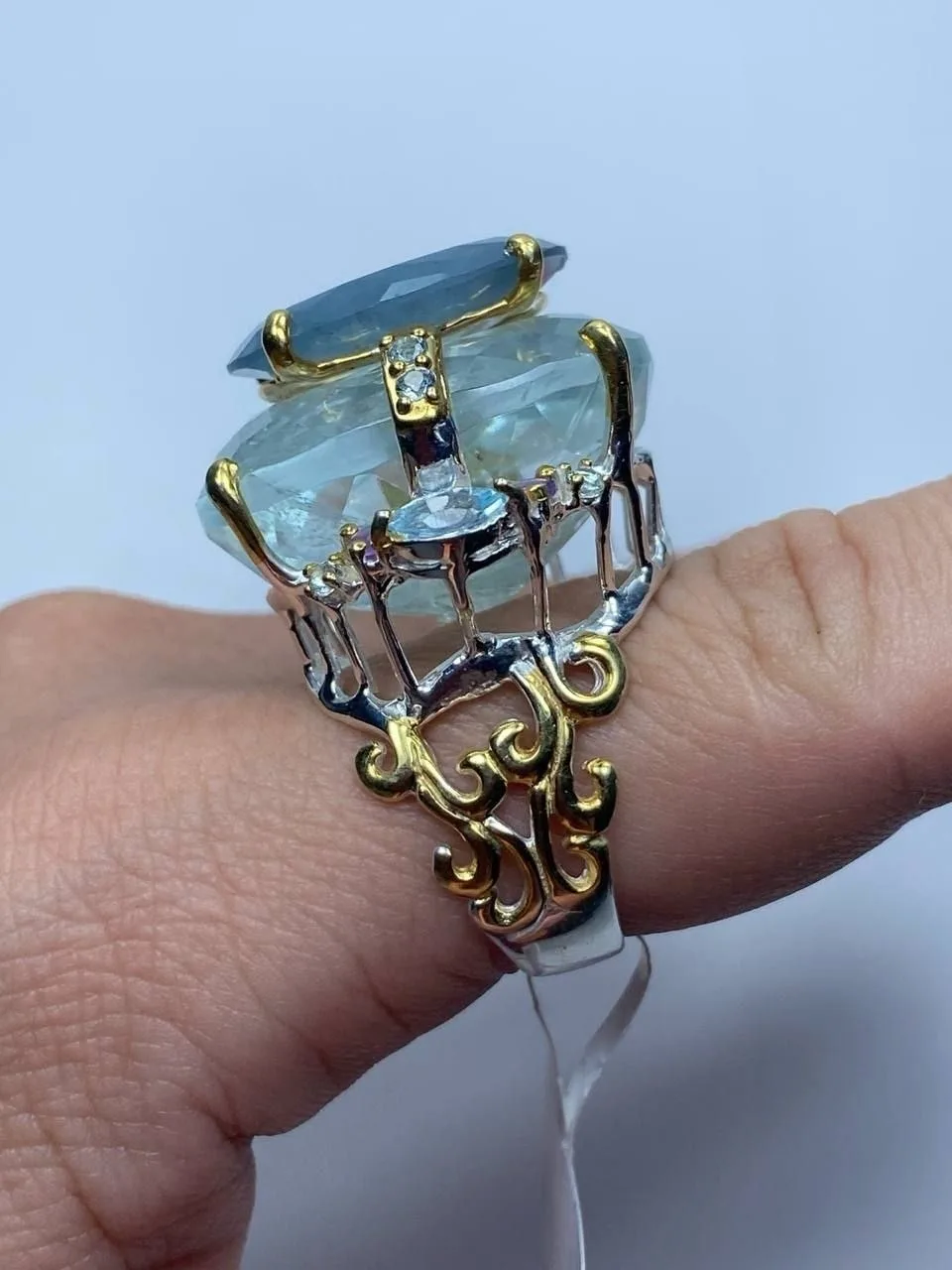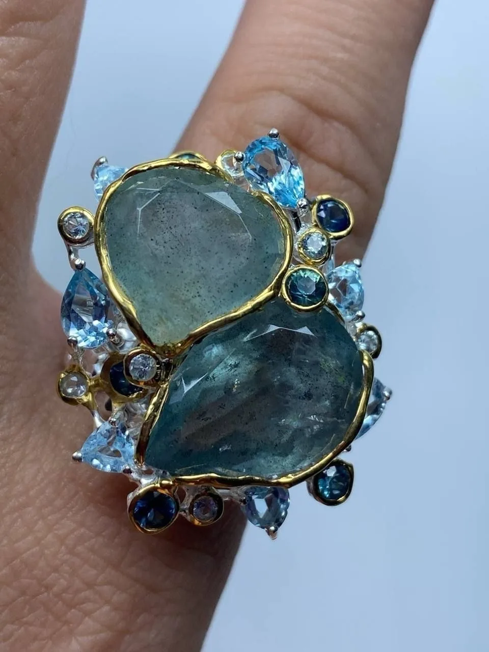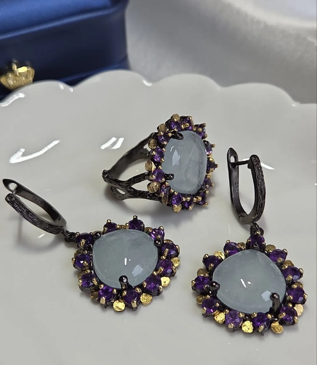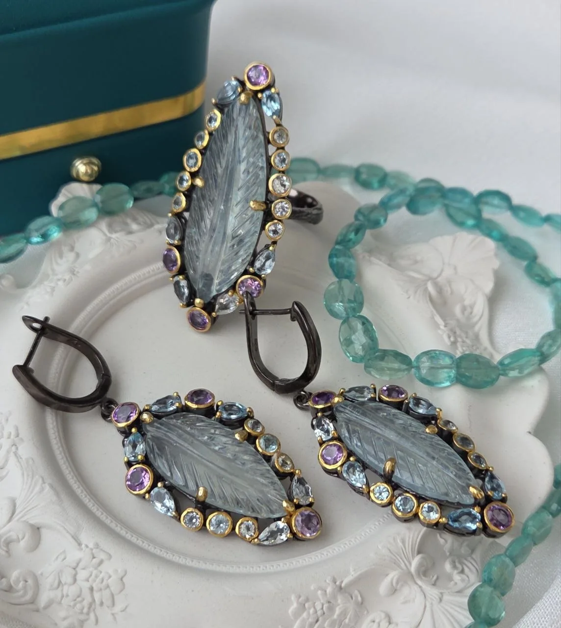 Вашему вниманию шикарный гарнитур с аквамаринами в ручной резной огранке, голубыми топазами и аметистами!