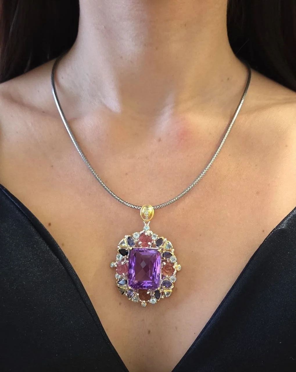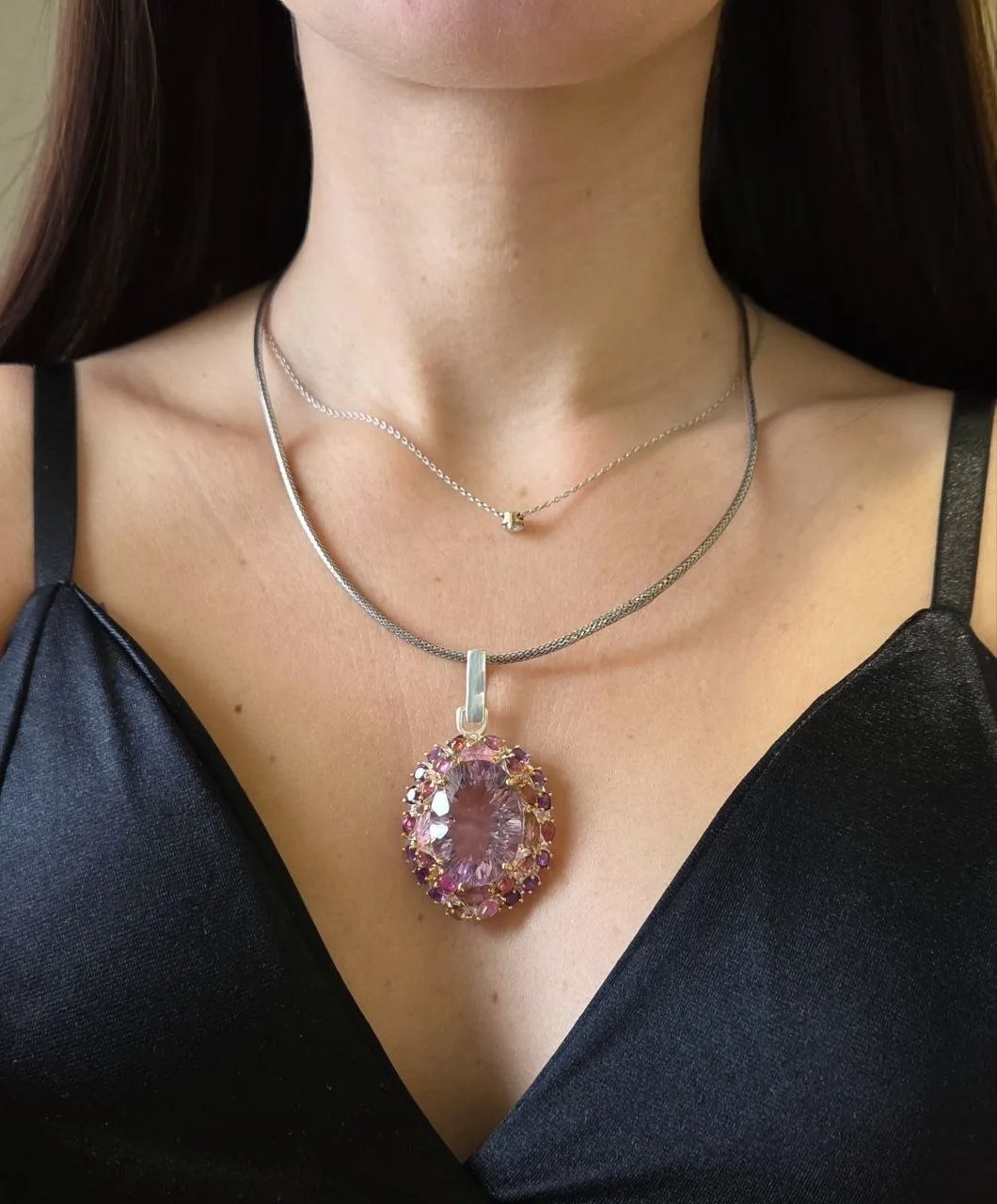Роскошный кулон с лавандовым аметистом в лазерной огранке, родолитами, аметистами и резными турмалинами!💫