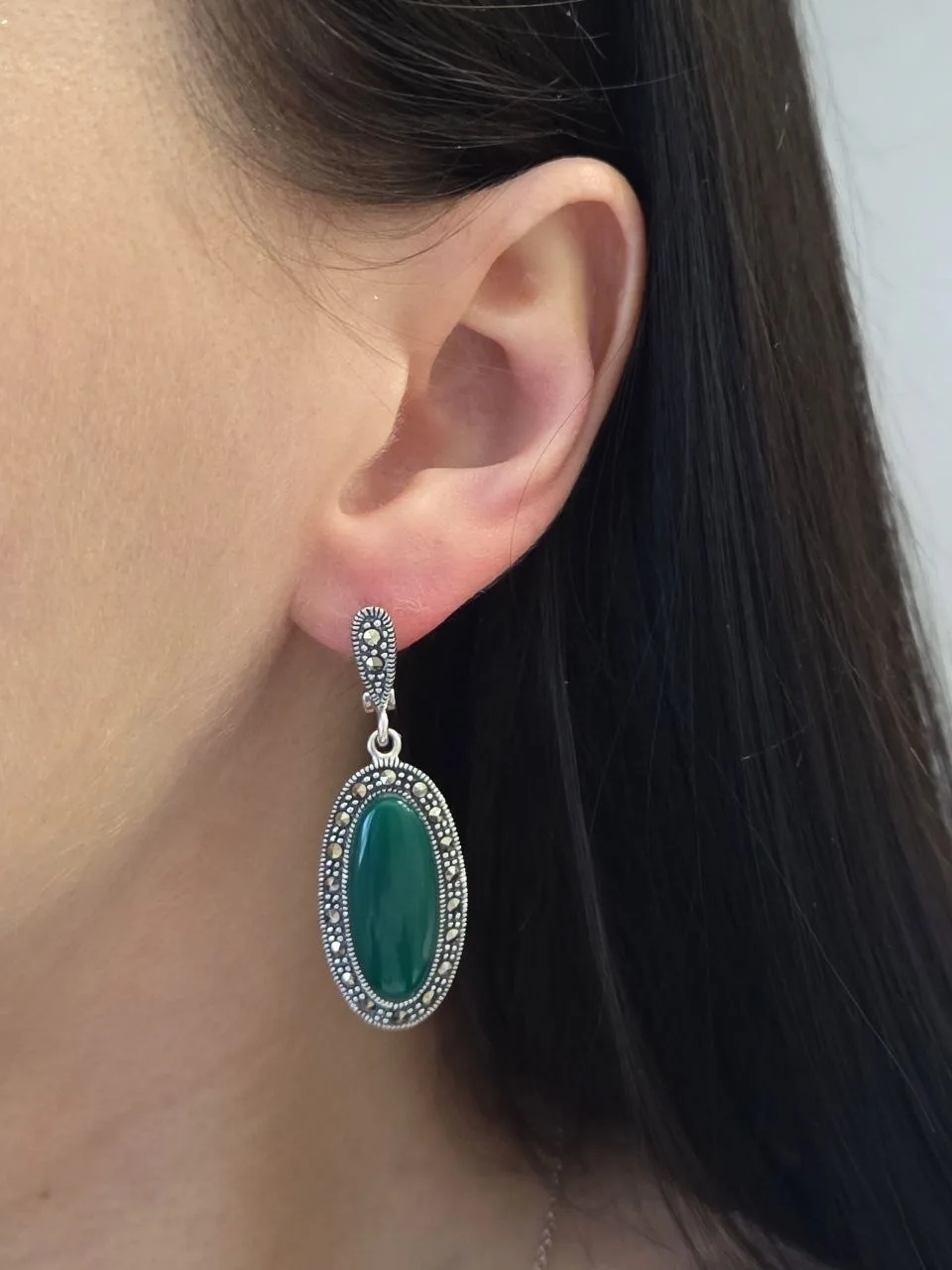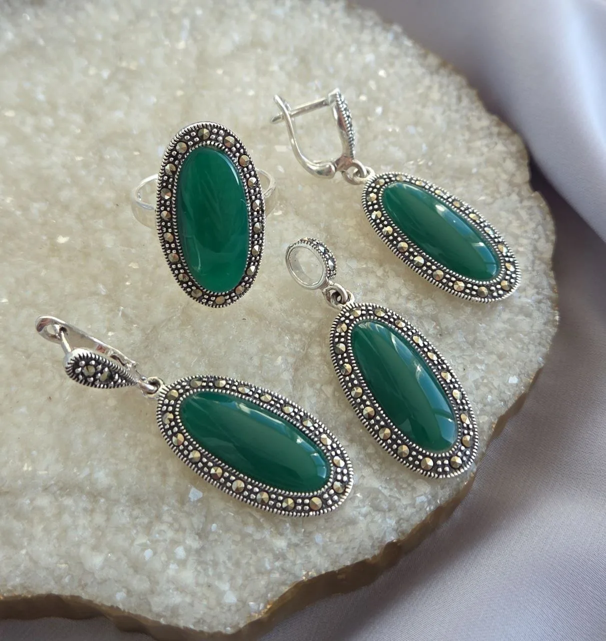 Крупный восхитительный гарнитур с зелёным ониксом и марказитами!