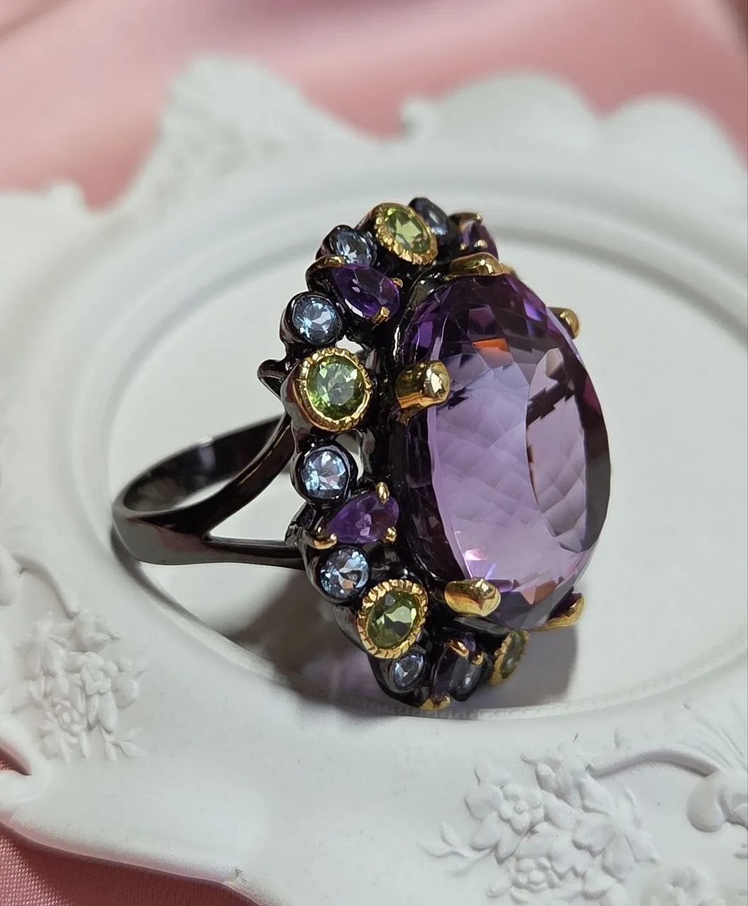 Крупное великолепное кольцо из черненого серебра с аметистами, хризолитами и топазами!💜