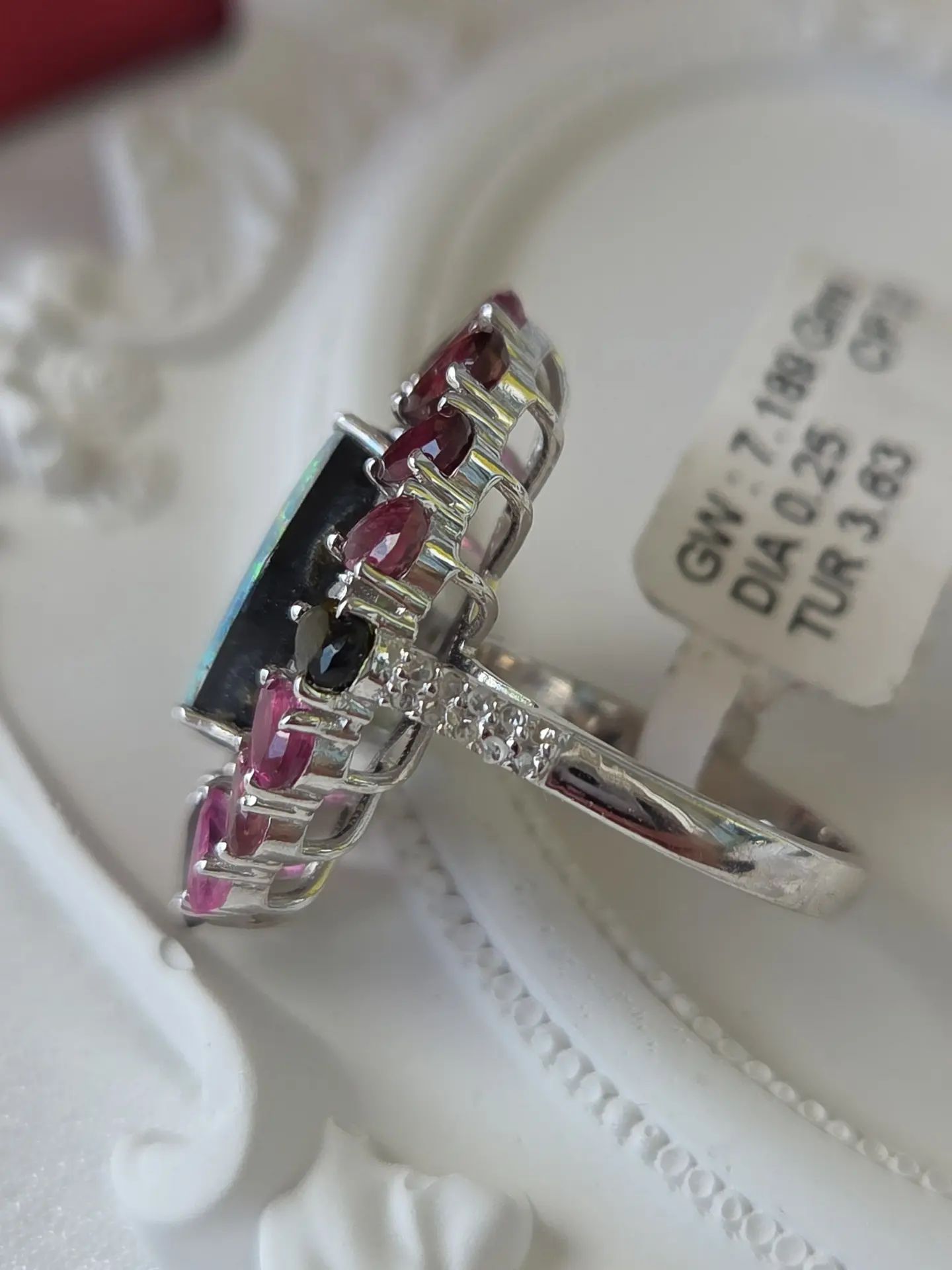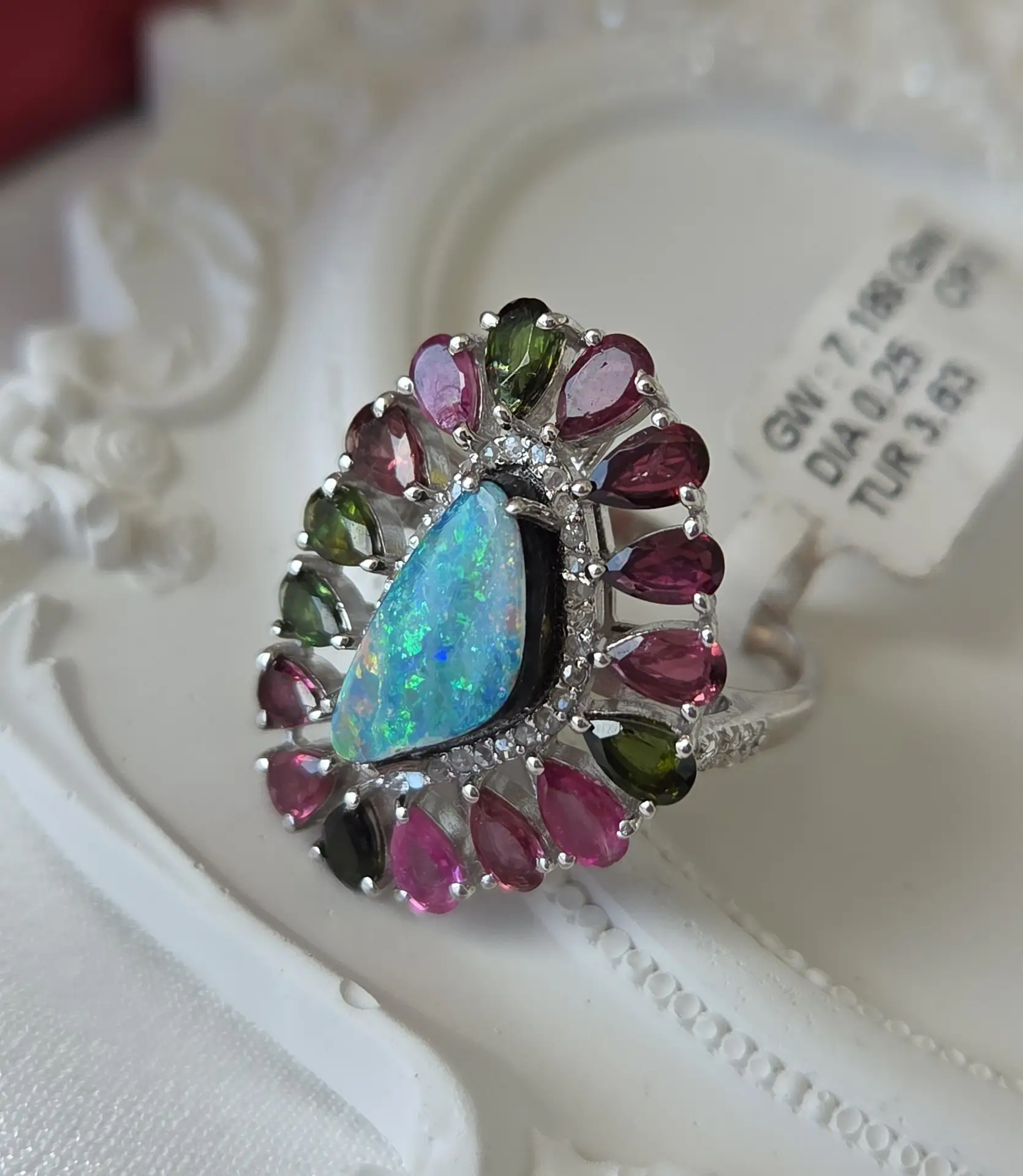 Обворожительное кольцо с ярким голубым опалом, цветными турмалинами и бриллиантами!