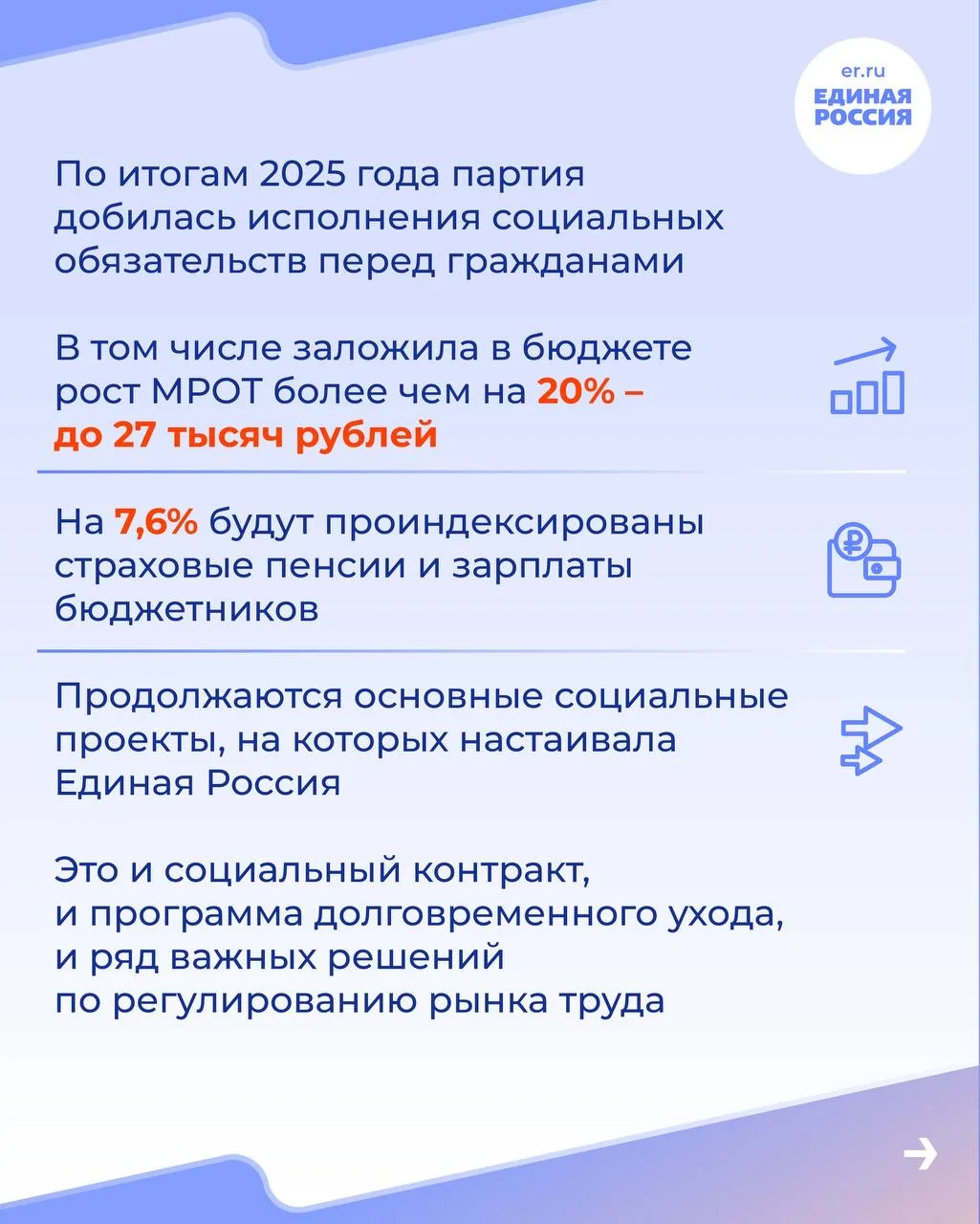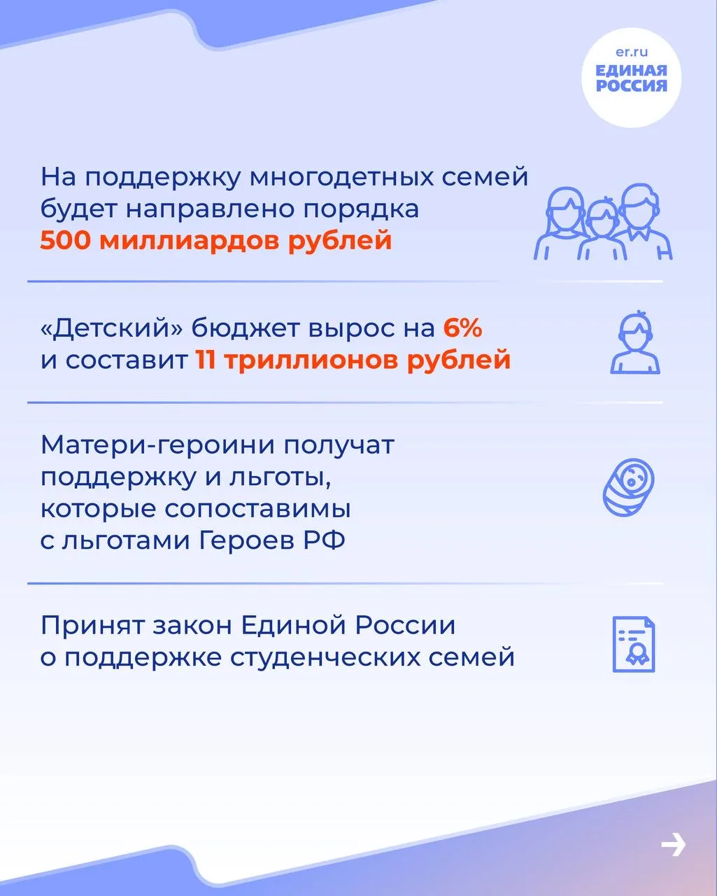 Считаю это важным результатом. Теперь есть финансовая основа для конкретных дел. В бюджет заложили множество положений из «Народной программы» партии «Единая Россия». В частности, индексация всех социальных выплат, включая пенсии, выше инфляции. С 1 января МРОТ вырастет до 27 тысяч. Много средств пойдёт на поддержку семей с детьми, в том числе многодетных.