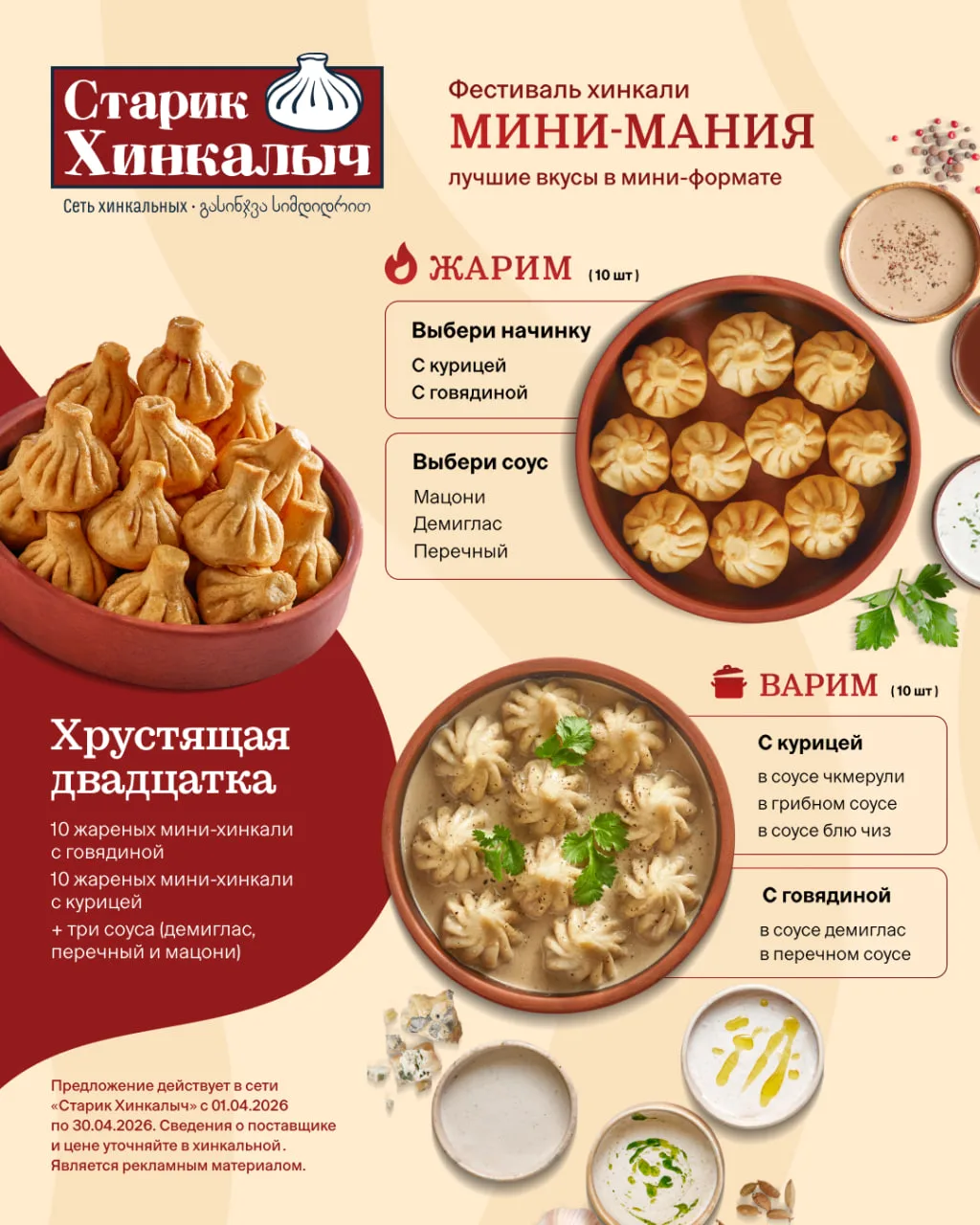 Для истинных гурманов мы подготовили сет «Хрустящая двадцатка». В него входят 10 жаренных мини-хинкали с курицей и 10 жаренных мини-хинкали с говядиной. Подаётся с тремя фирменными соусами: демиглас, перечный и мацони.