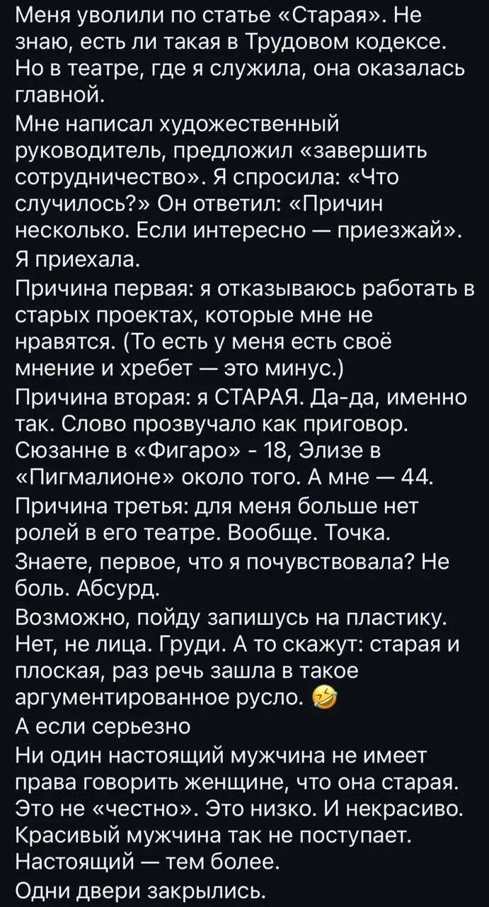 Екатерину Волкову уволили из театра из-за того, что она «старая» Ей 44 года.