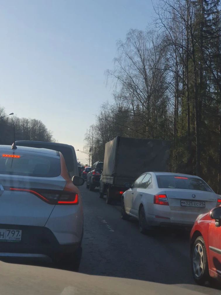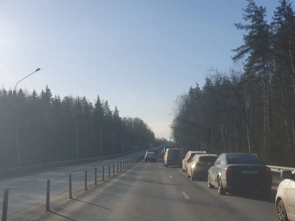 Доброе утро. Затор на Выборгском шоссе у строительного магазина в сторону СПб.