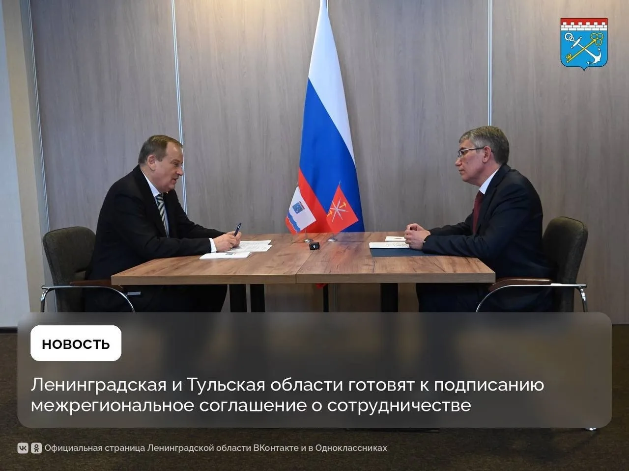 Губернатор Ленинградской области Александр Дрозденко и губернатор Тульской области Дмитрий Миляев готовят к подписанию межрегиональное соглашение о сотрудничестве.