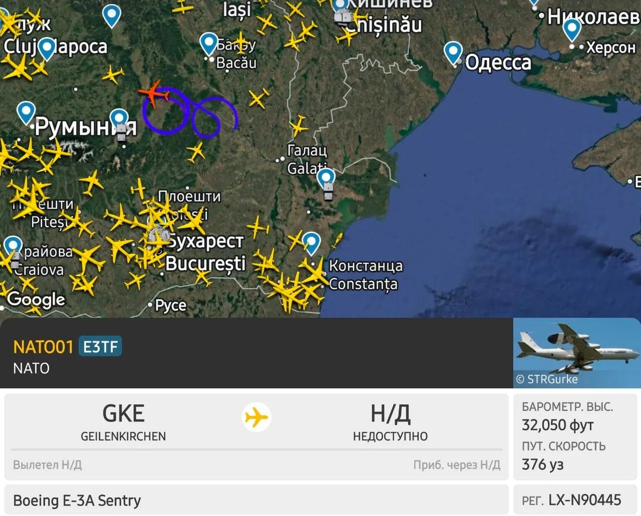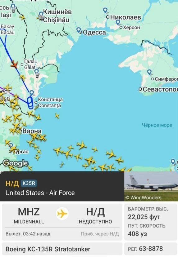 Два над акваторией Чёрного моря, два над территорией Румынии. Все самолёты осуществили дозаправку в воздухе от топливозаправщика. Два самолёта разведчика Boeing P-8A Poseidon и Boeing E-3A Sentry серьёзные "гости" и в спайке могут выявлять активность ПВО и прокладывать маршруты вражеских ракет и дронов.