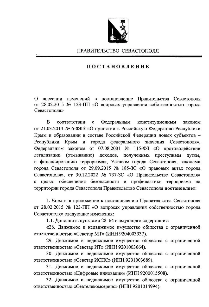 Сегодня утром на заседании Правительства приняли постановление об изъятии в государственную собственность Севастополя движимого и недвижимого имущества, находящегося в собственности юридических и физических лиц, в том числе, иностранных, оказывающих помощь ВСУ и ГУР Украины.