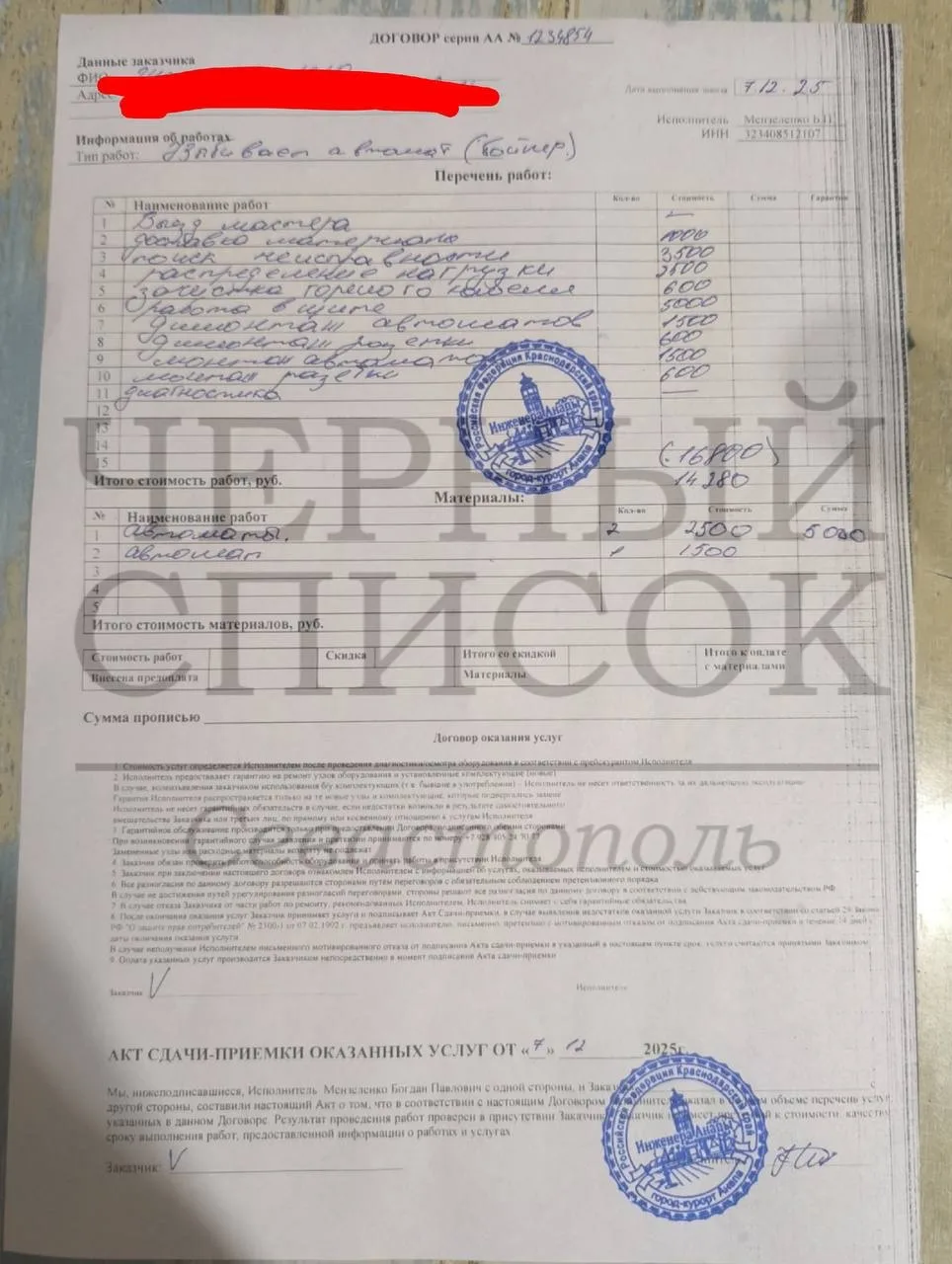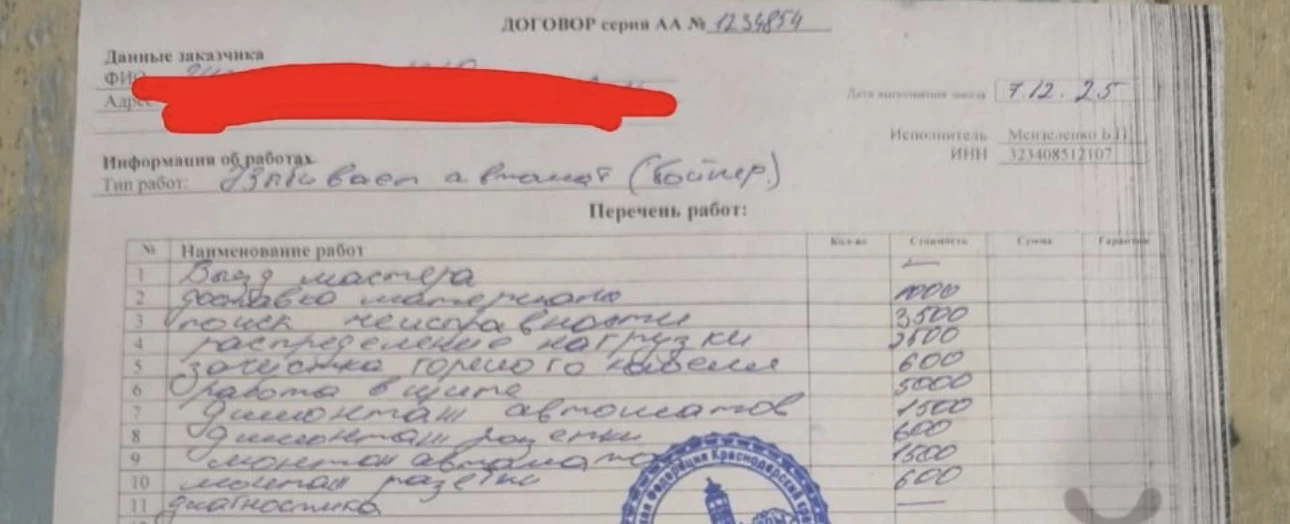 Вызвала электрика в воскресенье в обед, вырубал автомат. Через пару часов пришли приятные парнишки, начали активно чинить, болтать, 2 раза заикнулись про цену "нужно сказать цену" "скажи цену" но так и не сказали конкретно. По цене автомата тоже то 2000 , то 2700 р сошлись что по 2500 но чеков нет. Пусть думаю дорого, но вечер воскресенья же...работу сделали даже через чур. Просила сменить 2 поплавившихся автомата, сменили 3 без моего согласия. Составили бланк работы на 21800 р за смену 3 автоматов. За работу ребята взяли 16800( вызов,диагностика и тд...) +5000 за автоматы. Я с ценой не согласилась. Платить хозяйке, но тут очевидно развод. Они поехали к хозяйке общаться, и онао отказалась платить всю сумму. Пытались договориться на меньше по рыночной цене или решать через Роспотребнадзор. В итоге приехал вышибала, ломился в квартиру ко мне и после моего объяснения обрезал провод автомата, вырвал его и ушел...сказал будешь сидеть без света тогда. Тем самым обесточив не только мою квартиру, а ещё и соседей. Человек застрял в 90-х .Камера в подъезде его не смутила, угрожать женщине с детьми не смутило. Хочеться что бы у него не было возможности больше работать. Желаю ему поменьше заказов.