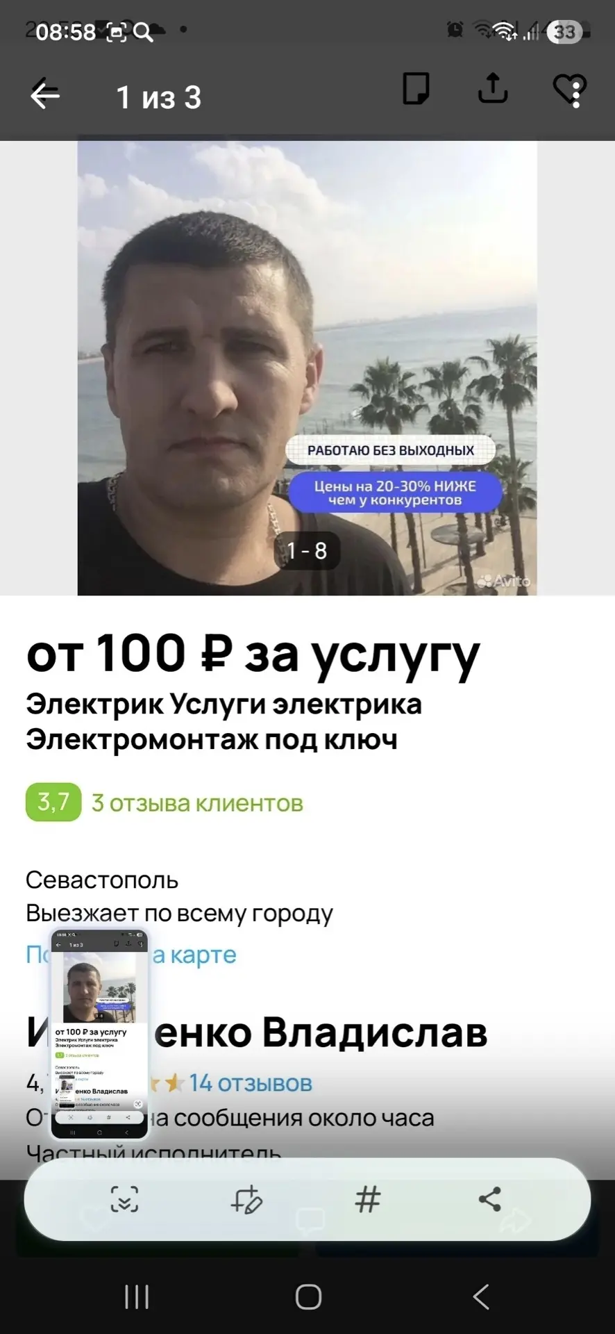 Здравствуйте,хочу предостеречь всех от обращения к данному 'мастеру'. Ситуация вот в чем. Ночью дома пропал свет,не помагало ни включение автоматов ничего. Дождавшись утра,вызвала первого попавшегося мастера с авито. Этот товарищ,приехав обозначил мне сумму в 15000,за замену автоматов. Видя мое замешательство,сказал,что поставит мне дорогие хорошие автоматы,на что я согласилась. При работе выявил еще один автомат,взял еще 3000 ( хотя поставил похоже б/у). Итого 18000. Я ничего не понимаю в электрике. Вообщем,когда я показала знакомым,что мне поставил этот товарищ,надо мной громко смеялись. Знаю,что сама виновата,поспешила и не послала его куда подальше. Пишу этот пост,для того,чтобы к подобному рода мастерам меньше людей обращалось. Пожалуйста анонимно