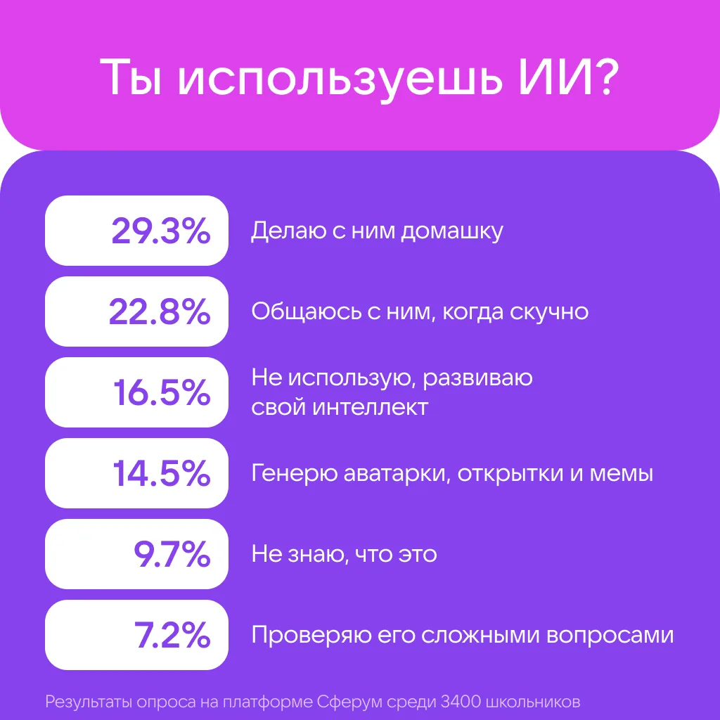29% опрошенных признались, что используют ИИ при выполнении домашних заданий. Почти каждый четвёртый переписывается с нейросетями от скуки. А некоторые с помощью ИИ создают аватарки и мемы.