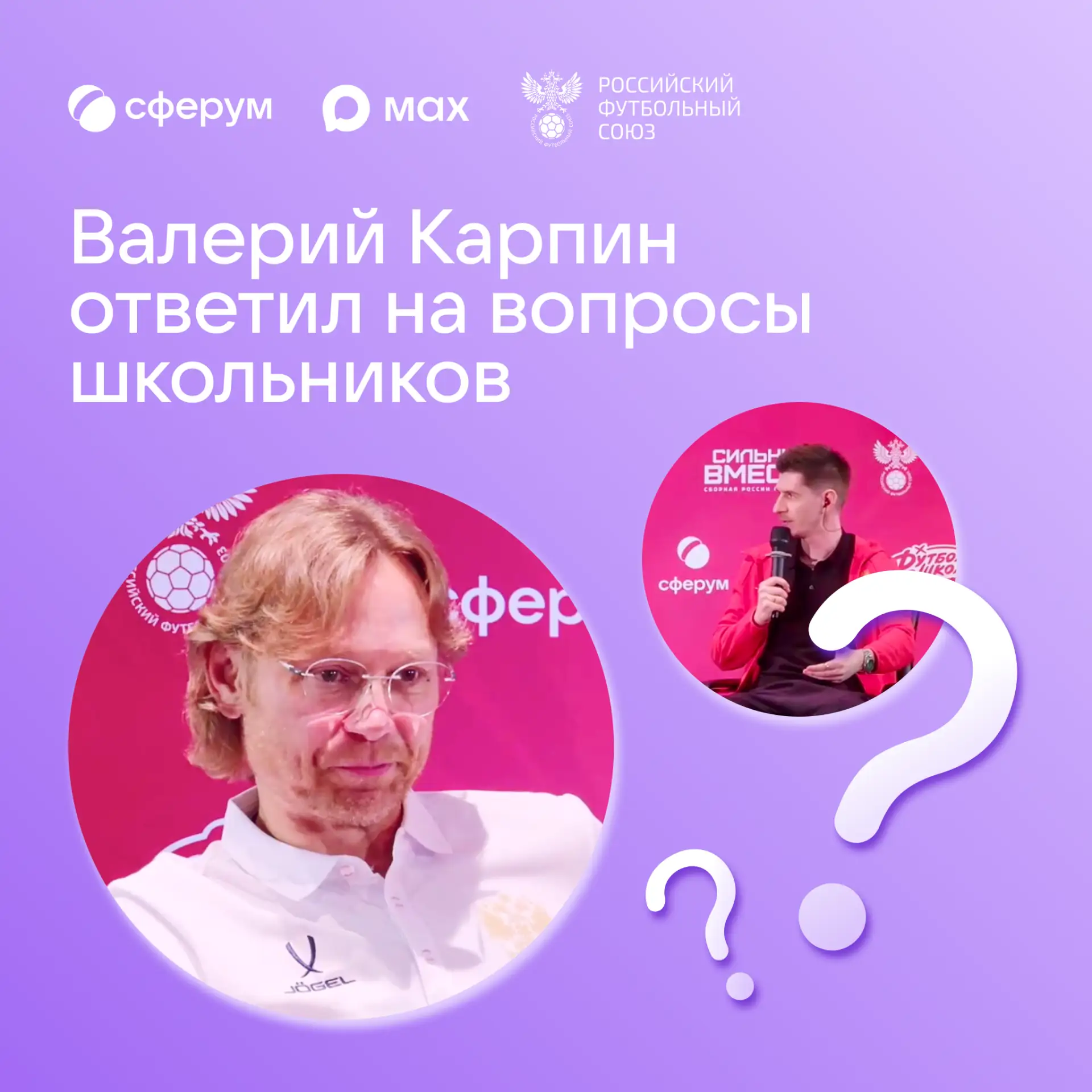 Сферум собрал почти 13 000 вопросов главному тренеру сборной России по футболу. Дети спрашивали его о жизненных принципах, победах и поражениях, спортивной карьере и перспективных молодых футболистах. Самые интересные вопросы были озвучены в прямом эфире.