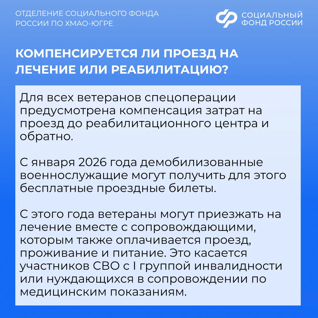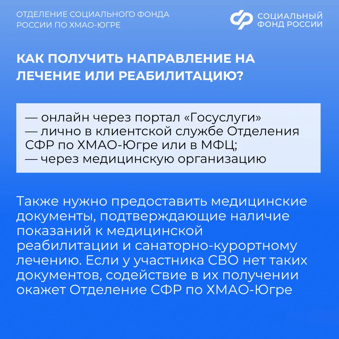 Отделение СФР по ХМАО-Югре обеспечивает индивидуальное сопровождение ветеранов СВО на протяжении всего процесса: с момента подачи заявления, пока находятся на лечении и до возвращения домой.