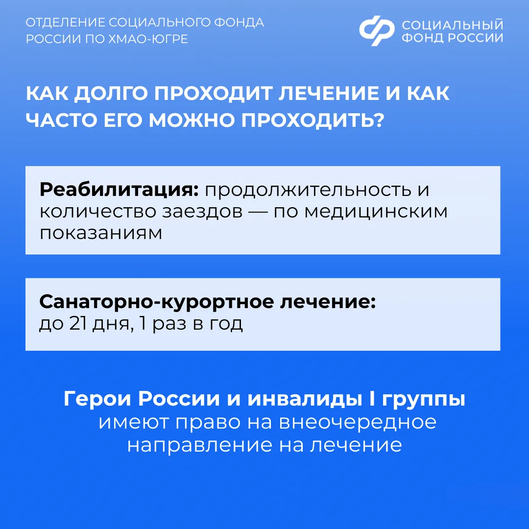 Решение о направлении на санаторно-курортное лечение или медицинскую реабилитацию принимается в течение двух рабочих дней после подачи заявления. В течение дня после этого Отделение СФР по ХМАО-Югре сообщает ветерану о результатах.