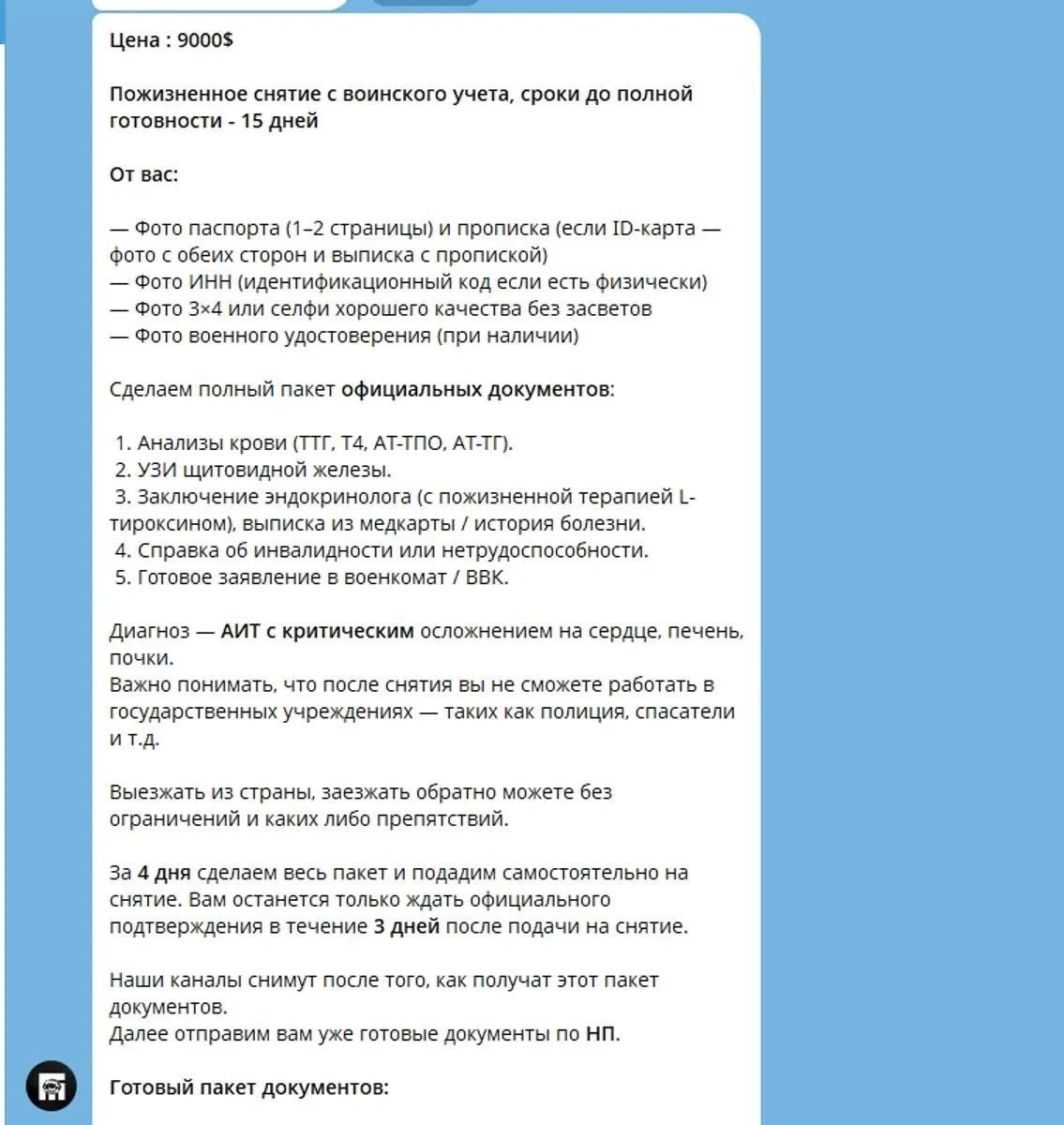 Итак, самая бюджетная услуга - снятие с розыска ТЦК стоит от $300 до $2000, оформление фиктивной инвалидности с возможностью выезда за границу, цена за нее достигает $50 000.