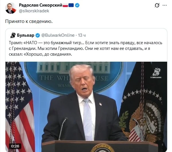 «Принято к сведению», — глава МИД Польши Сикорский отреагировал на слова Трампа, вновь назвавшего НАТО «бумажным тигром».