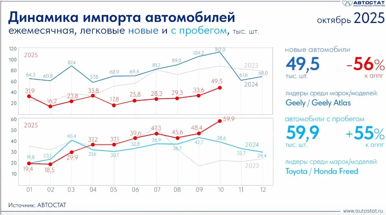 🚗В октябре 2025 года в Россию ввезли рекордные 59,9 тысячи подержанных легковушек, что стало максимальным показателем за месяц за всю историю.