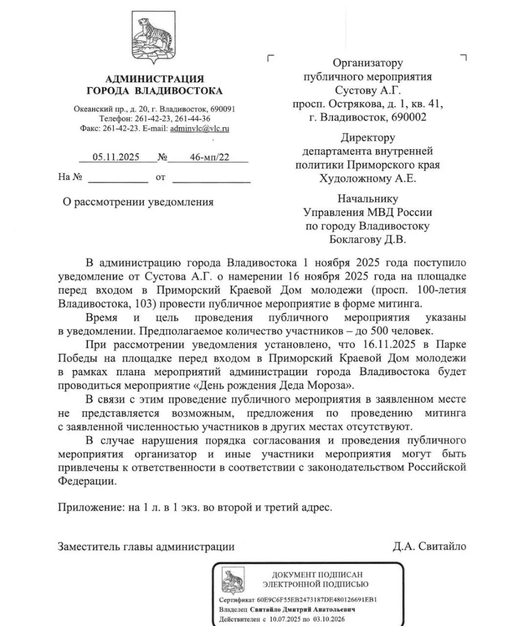 Во Владивостоке чиновники снова не разрешили митинг против повышения утильсбора — на этот раз из‑за дня рождения Деда Мороза.