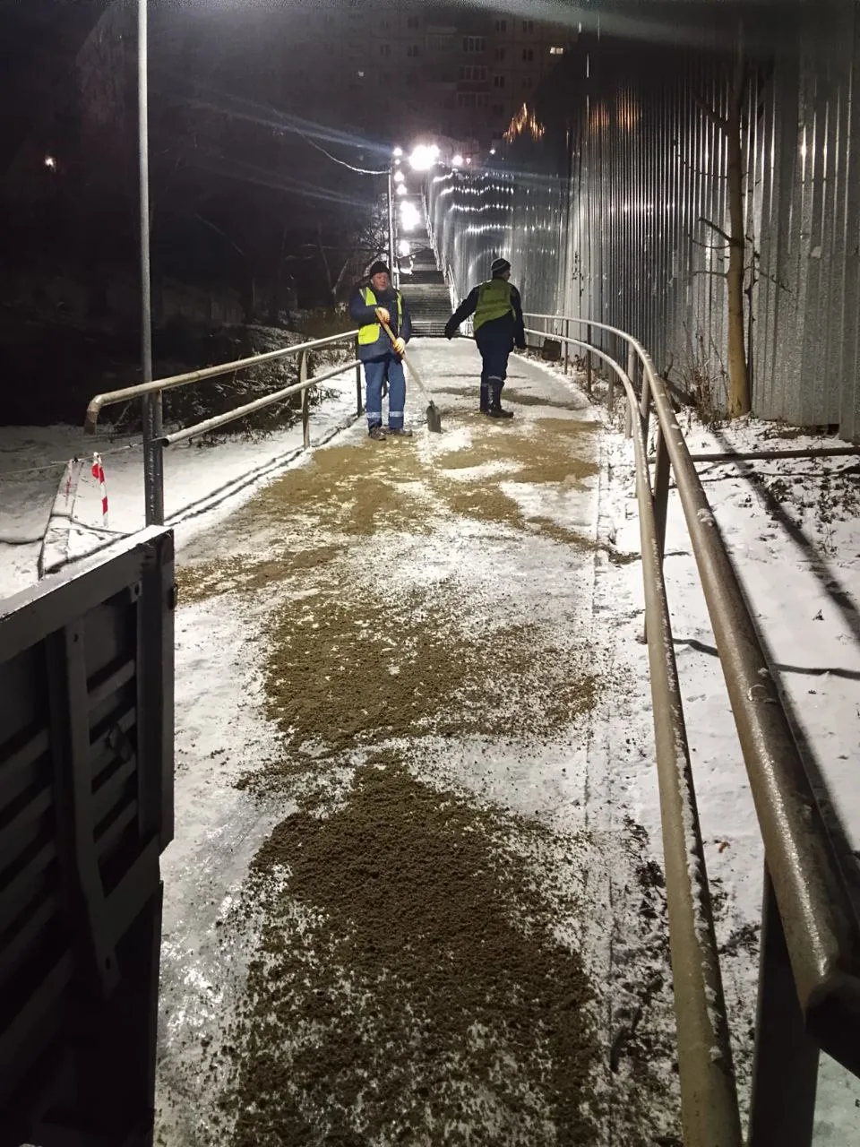 Спецтехника и рабочие дорожной службы «Содержание городских территорий» уже занимаются обработкой реагентами проезжей части, тротуаров, лестниц и виадуков.