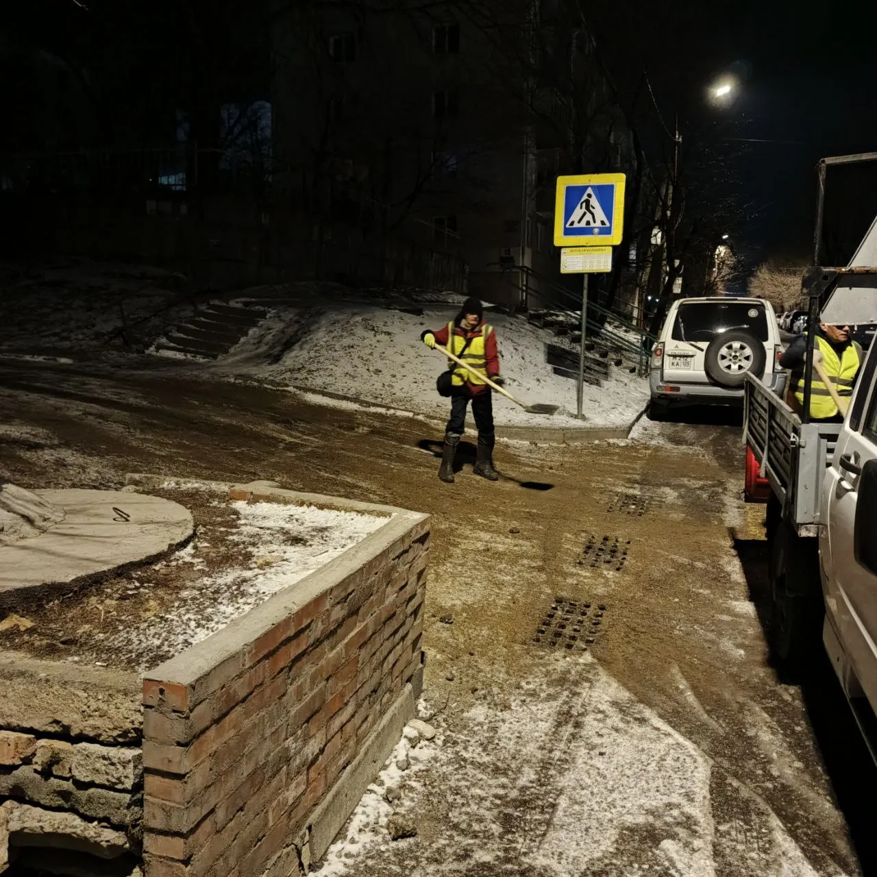 🟢Вручную рабочие просыпали песко-соляной смесью Аллилуева, проспект Острякова, Башидзе, переулок Павленко, Алеутскую, Океанский проспект и виадуки на Некрасовской, Калинина, Вилкова и по другим адресам.