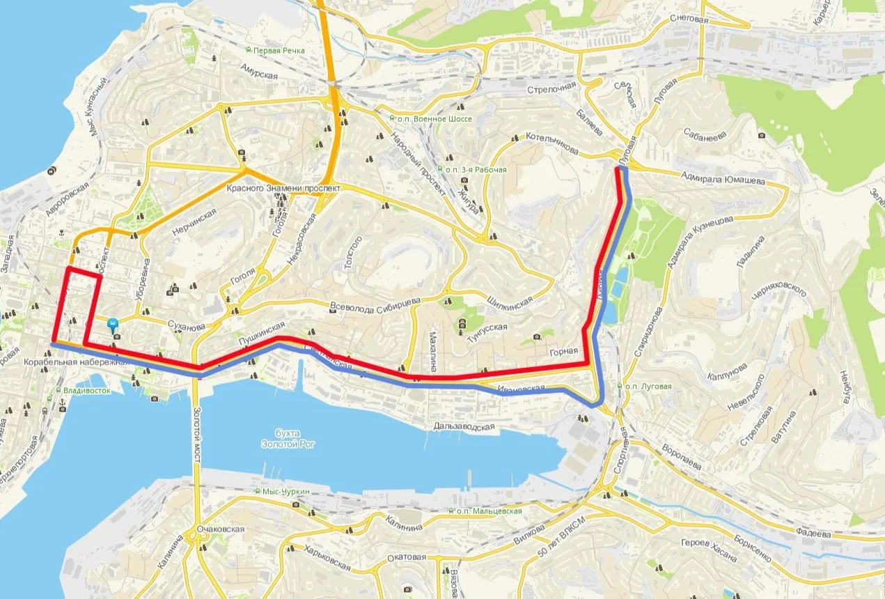 Баляева (Адмирала Юмашева, 2) – Баляева (Луговая, 85в) – Поликлиника – Горная – Детский Сад № 154 – Гайдамак – Авангард – Дальзавод – Цирк – ДВГТУ – Лазо – Площадь Борцов Революции – Океанский проспект – Фонтанная – Площадь Борцов Революции – Лазо – ДВГТУ – Цирк – Дальзавод – Авангард – Гайдамак – Луговая (ул. Новоивановская, д.3) – Поликлиника – Баляева (Юмашева, 2).