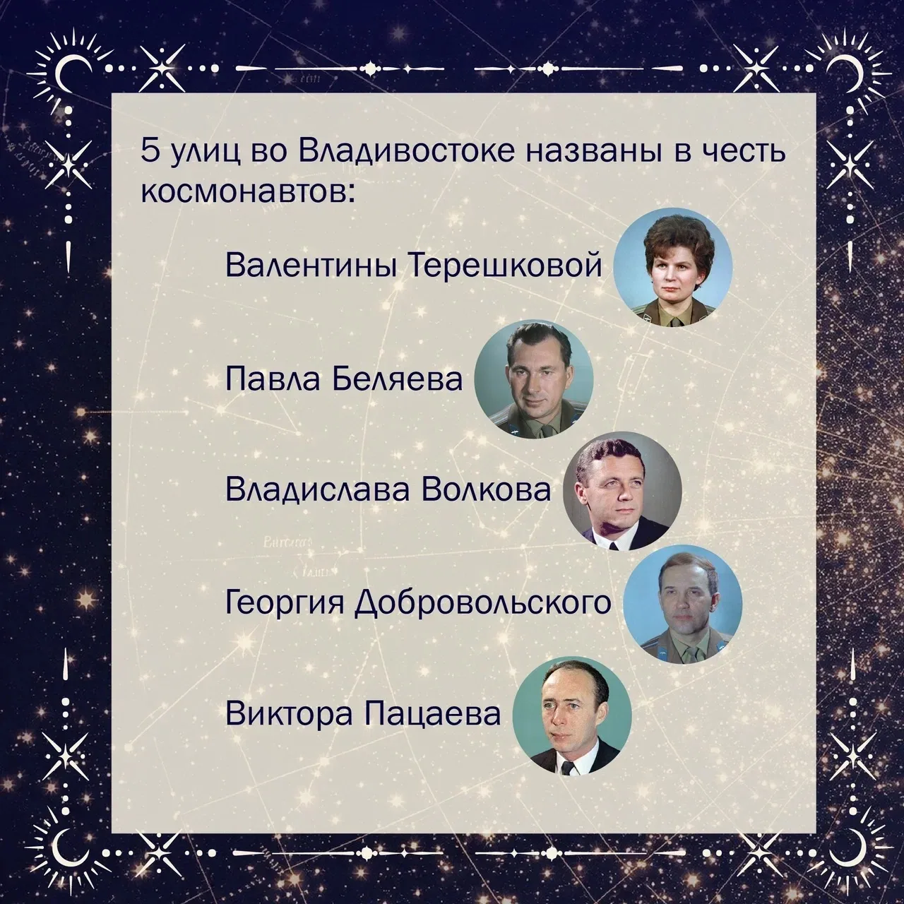 Во Владивостоке в честь героев-космонавтов названы улицы Беляева, Добровольского, Волкова, Пацаева и Терешковой.