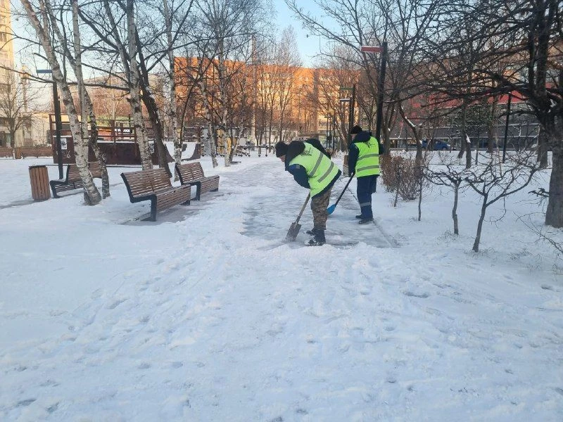 На пешеходных зонах и в парках Владивостока идет уборка снега.