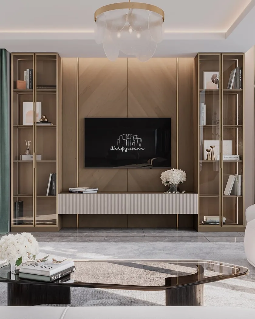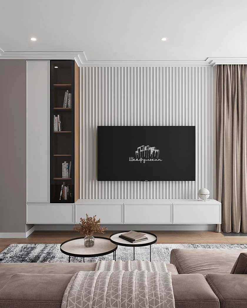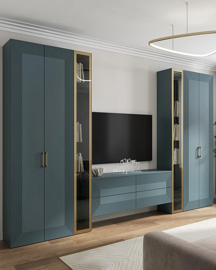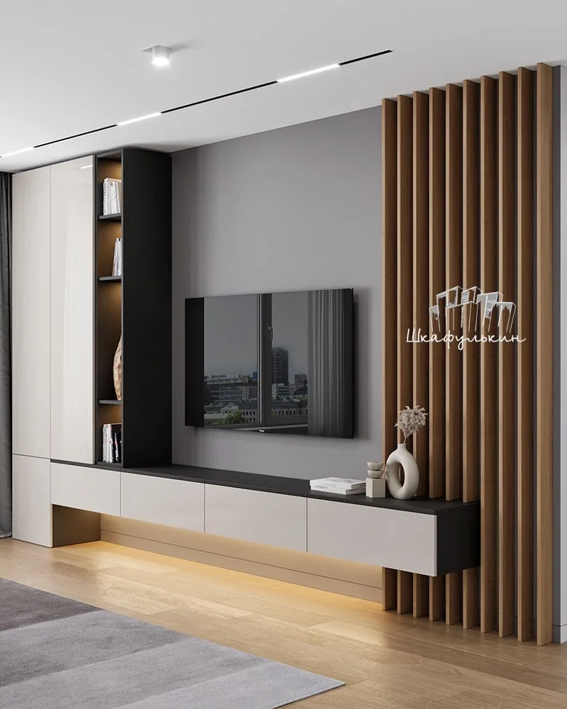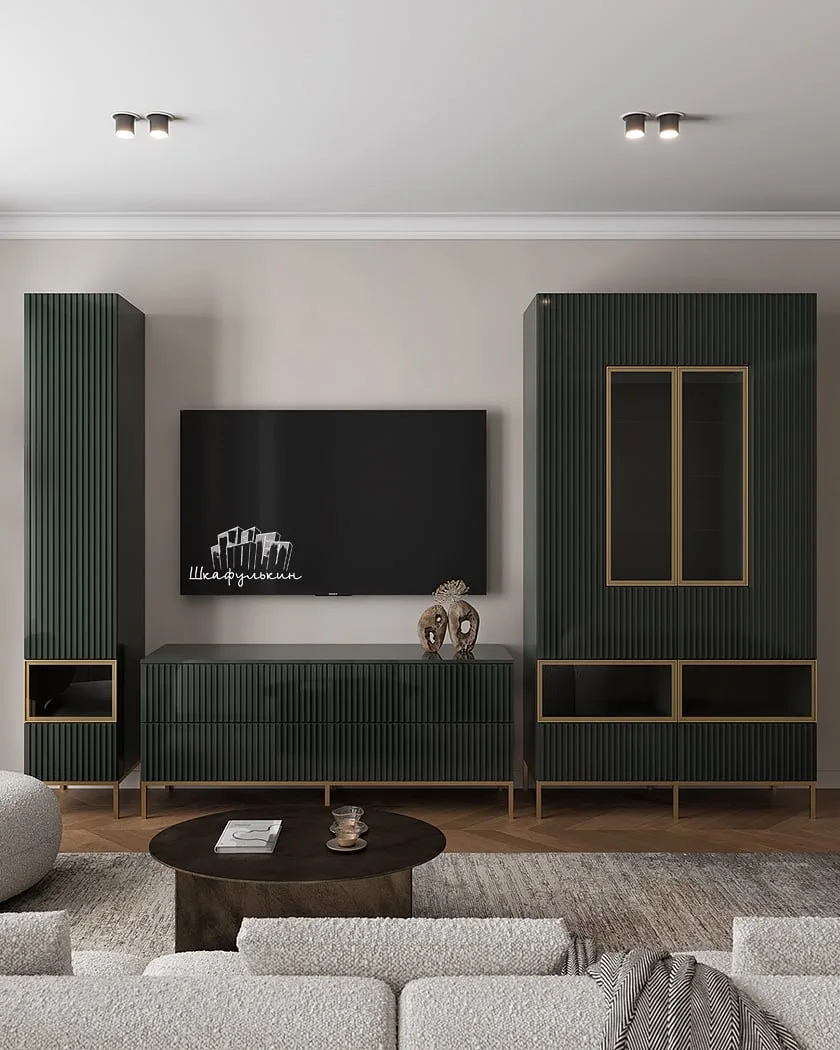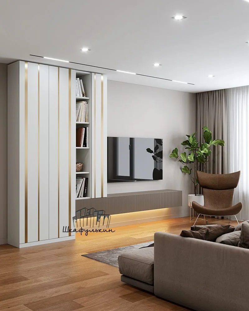 🫡В помещении с нестандартной планировкой стоит обратить внимание на компактные стенки и секции с яркими фасадами или обилием открытых полок. Также для небольшой гостиной подойдут компактные стеллажи или невысокие подвесные тумбы и комоды с небольшой глубиной (35-45 см).