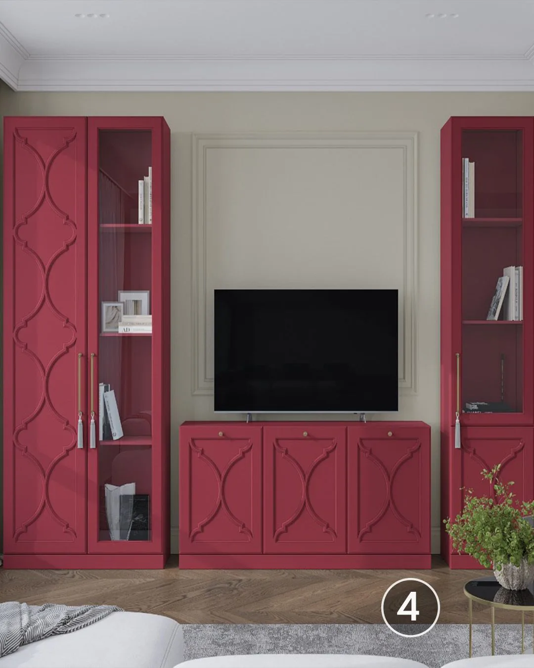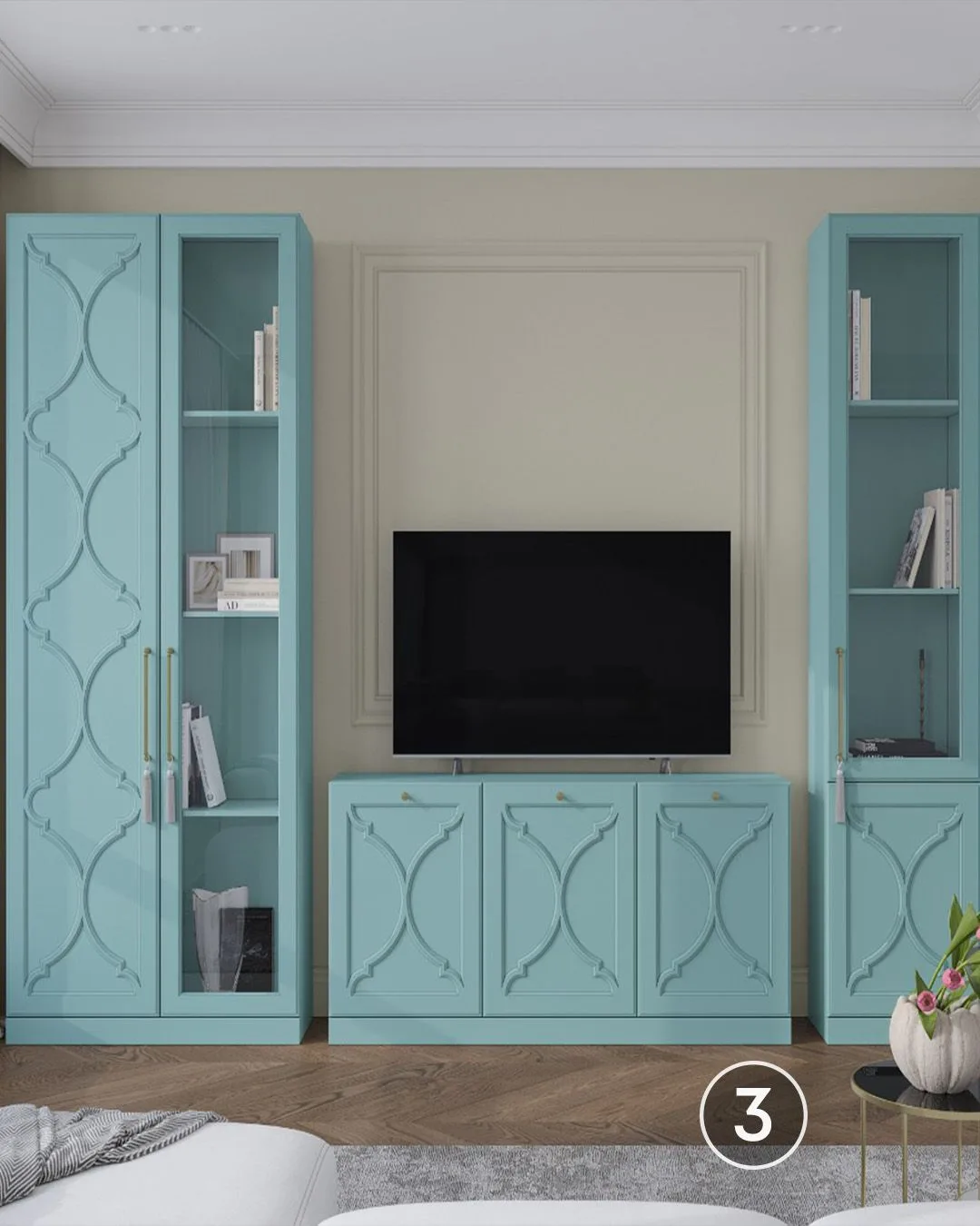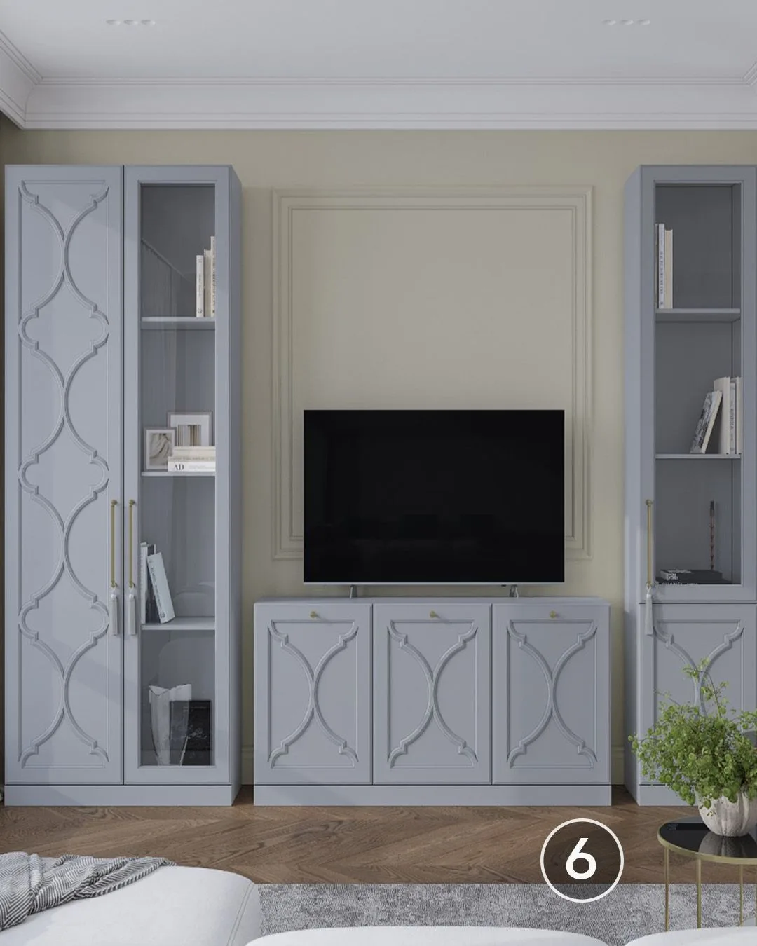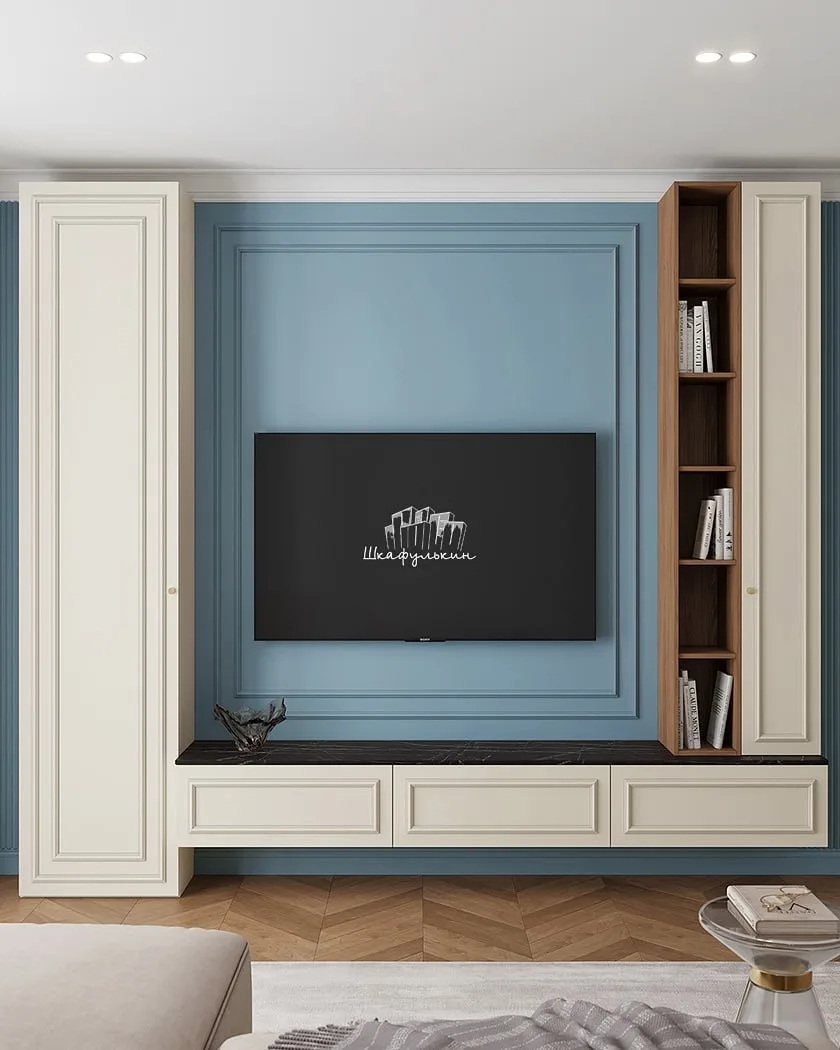 🫡В помещении с нестандартной планировкой стоит обратить внимание на компактные стенки и секции с яркими фасадами или обилием открытых полок. Также для небольшой гостиной подойдут компактные стеллажи или невысокие подвесные тумбы и комоды с небольшой глубиной (35-45 см).