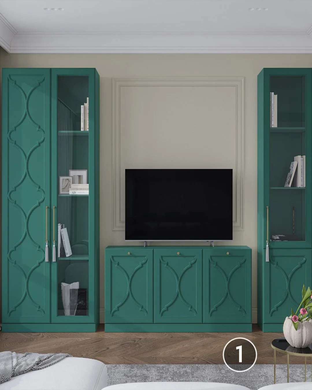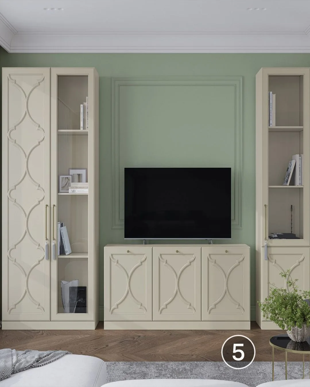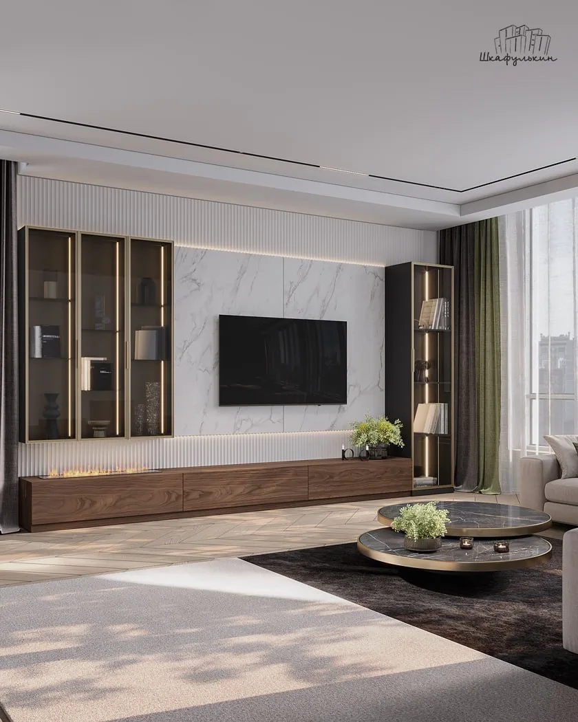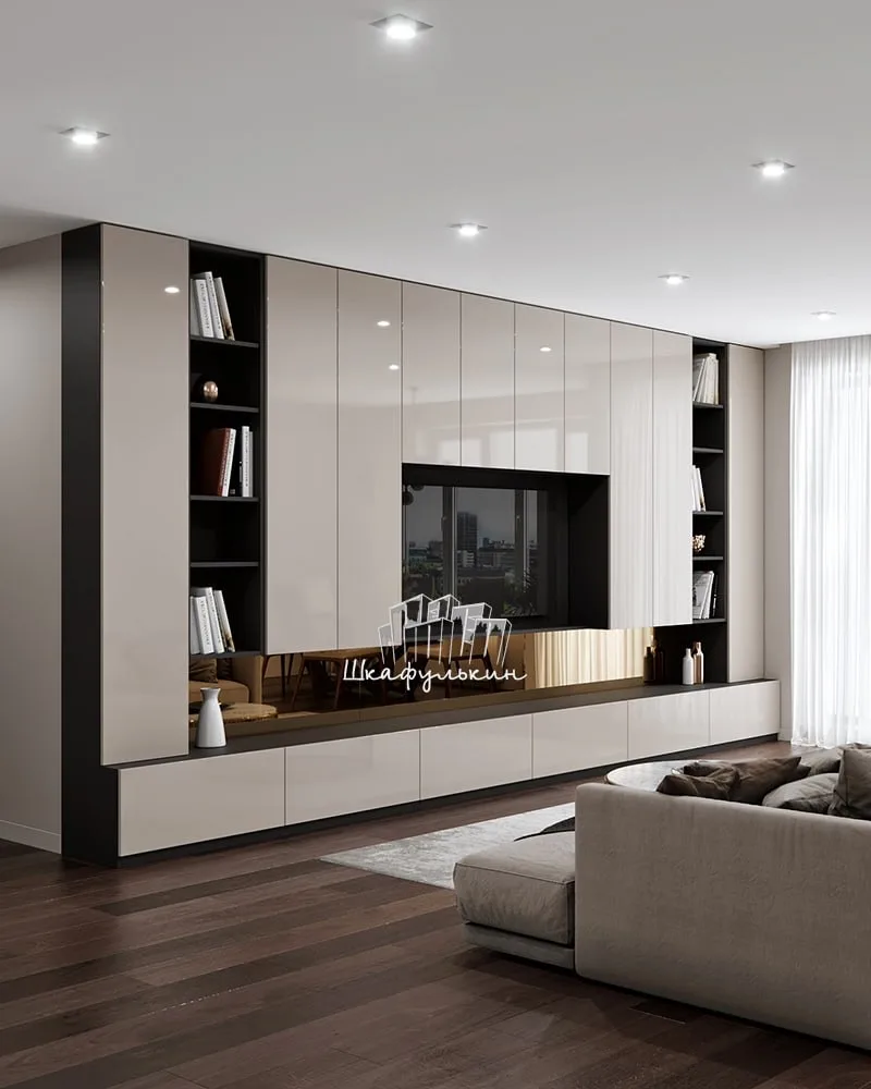 😭В просторной гостиной можно разместить несколько независимых секций и расставить их в комнате по своему усмотрению. Или же можно заполнить одну из стен шкафами, комодами и тумбами и даже добавить антресоли под потолок.