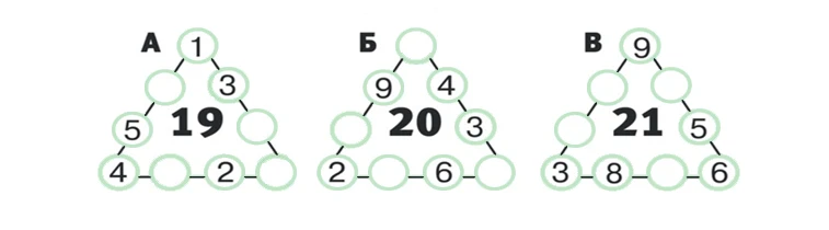 Во второй расположите пропущенные числа от 1 до 9 в кружках каждого ма¬гического треугольника так, чтобы сум¬ма трёх чисел на каждой стороне тре¬угольника равнялась числу, записанно¬му в центре треугольника.
