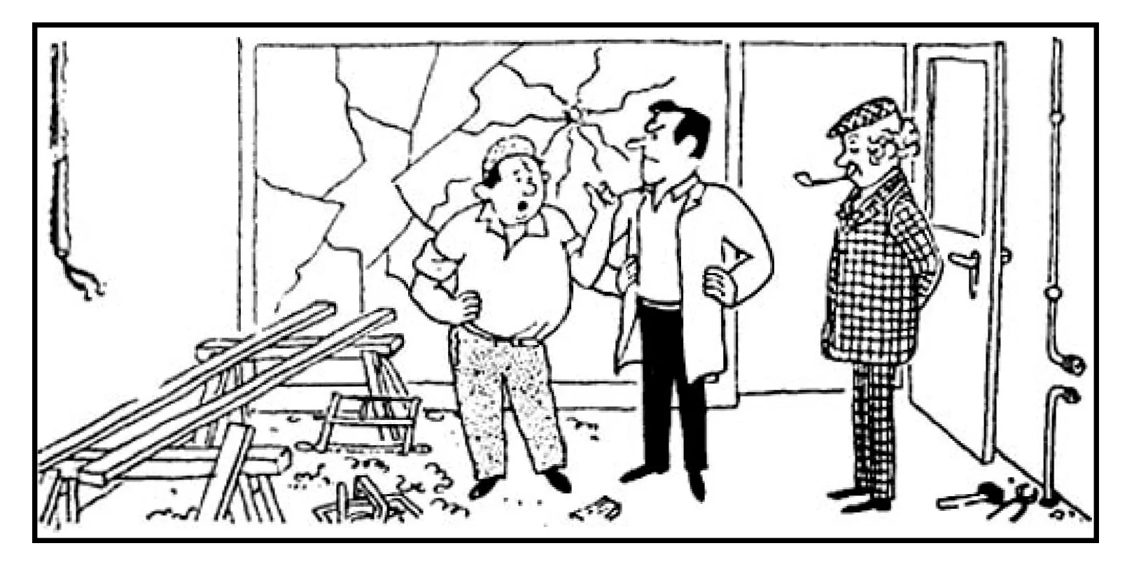- Нет, нет, мастер, я не буду возмещать стоимость вашего стекла. Посмотрите сами, ведь еще до того, как я его разбил, кто-то швырнул в него камень. Оно уже все равно никуда не годилось, и я здесь совершенно ни при чем. Ведь не стали бы ни вы, ни инспектор ругать свою жену за то, что она выбросила, наконец, в мусорный ящик давно треснувший кофейник.