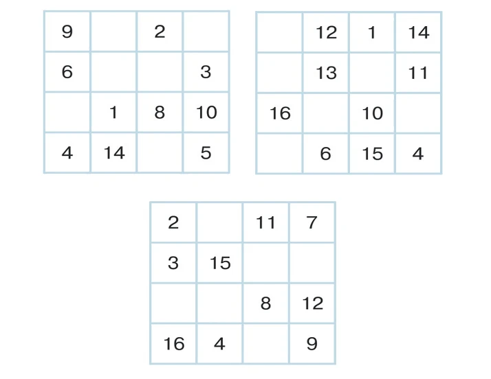 А в третьей расставьте в каждом ма¬гическом квадрате пропущенные чис¬ла от 1 до 16 так, чтобы сумма чи¬сел в каждом столбце, каждой строке и в каждой диагонали была равна 34. Числа не должны повторяться.