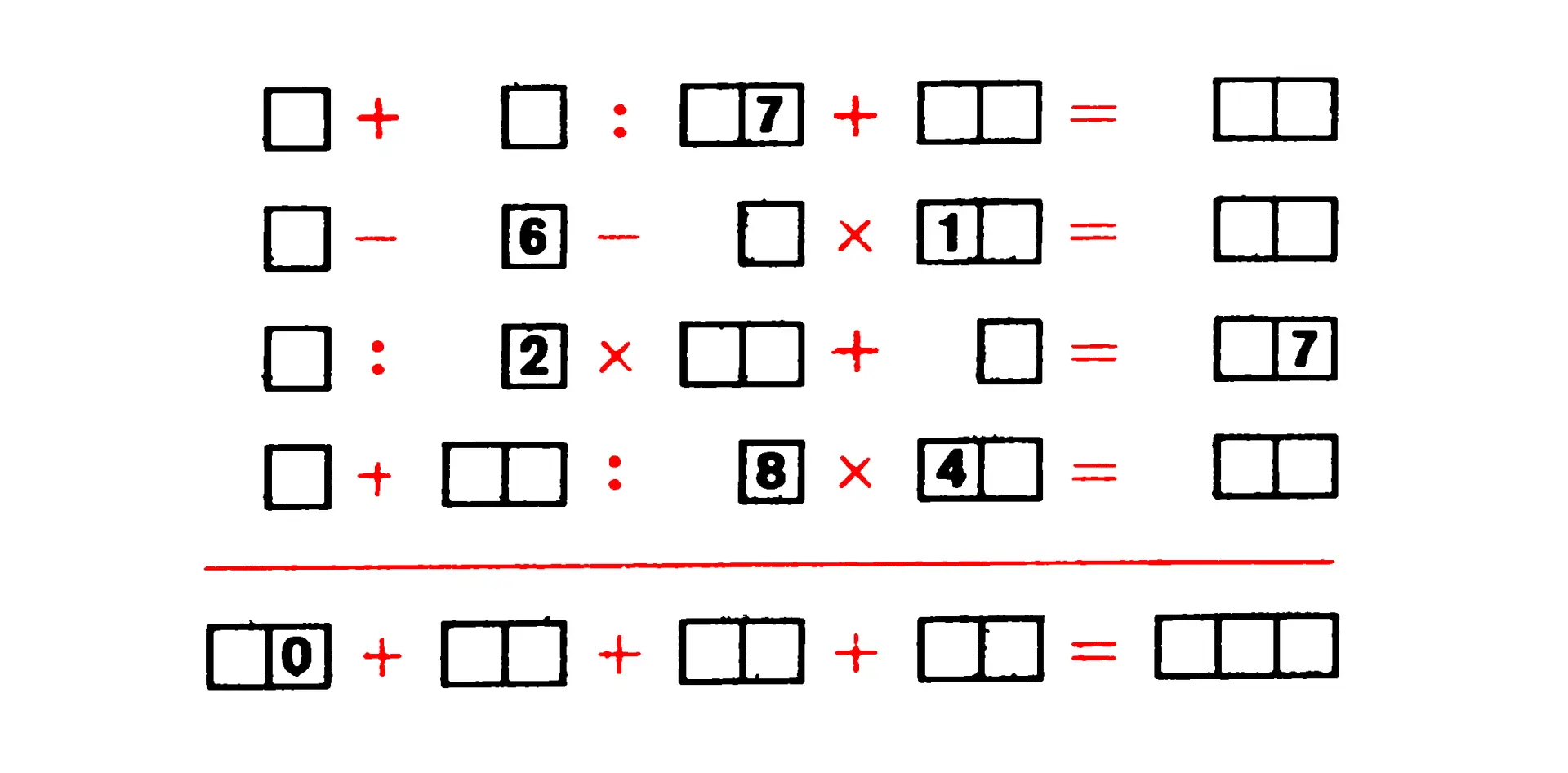 Каждый квадрат скрывает за собой какую-либо из цифр с иллюстрации предыдущего поста. Мат. знаки показывают действия, которые вам предстоит с этими цифрами выполнить (по горизонтали и вертикали).