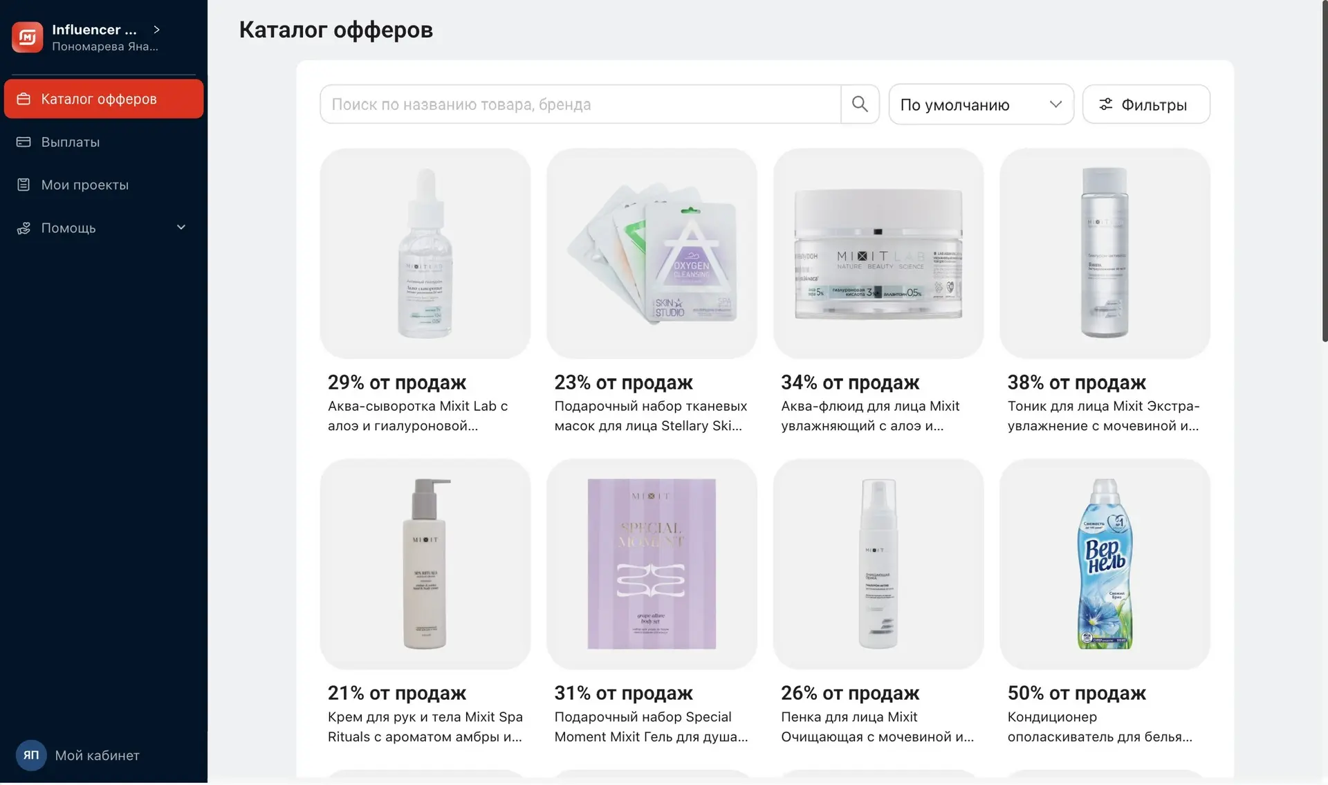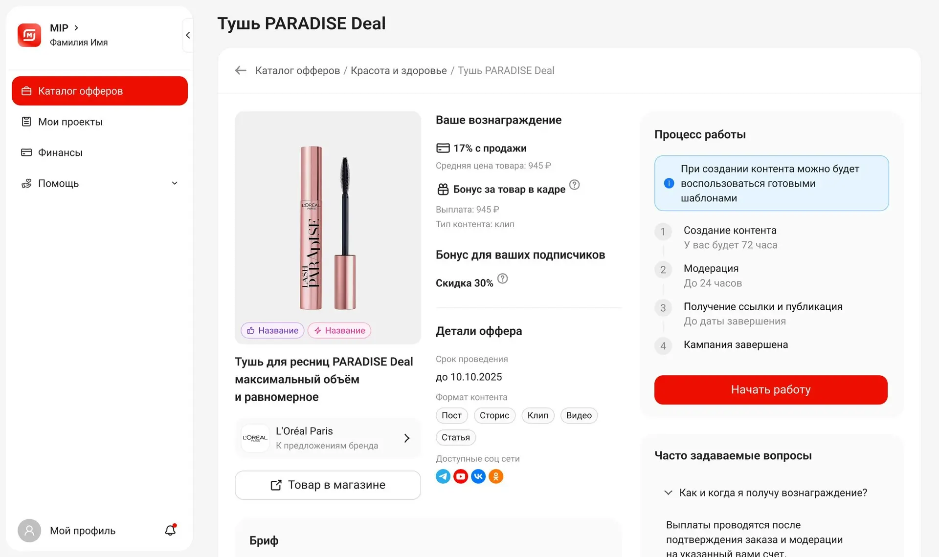 Компании размещают офферы и брифы с требованиями к интеграциям, а платят только за фактические продажи — без минимального порога по бюджету.