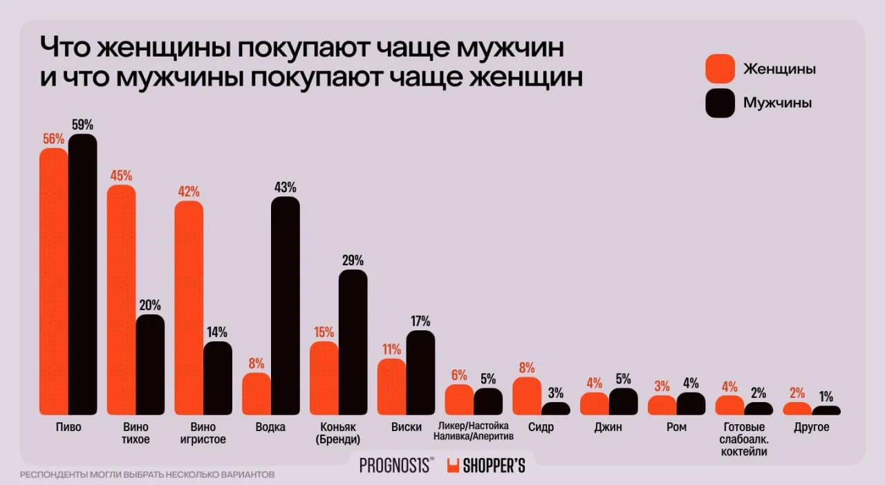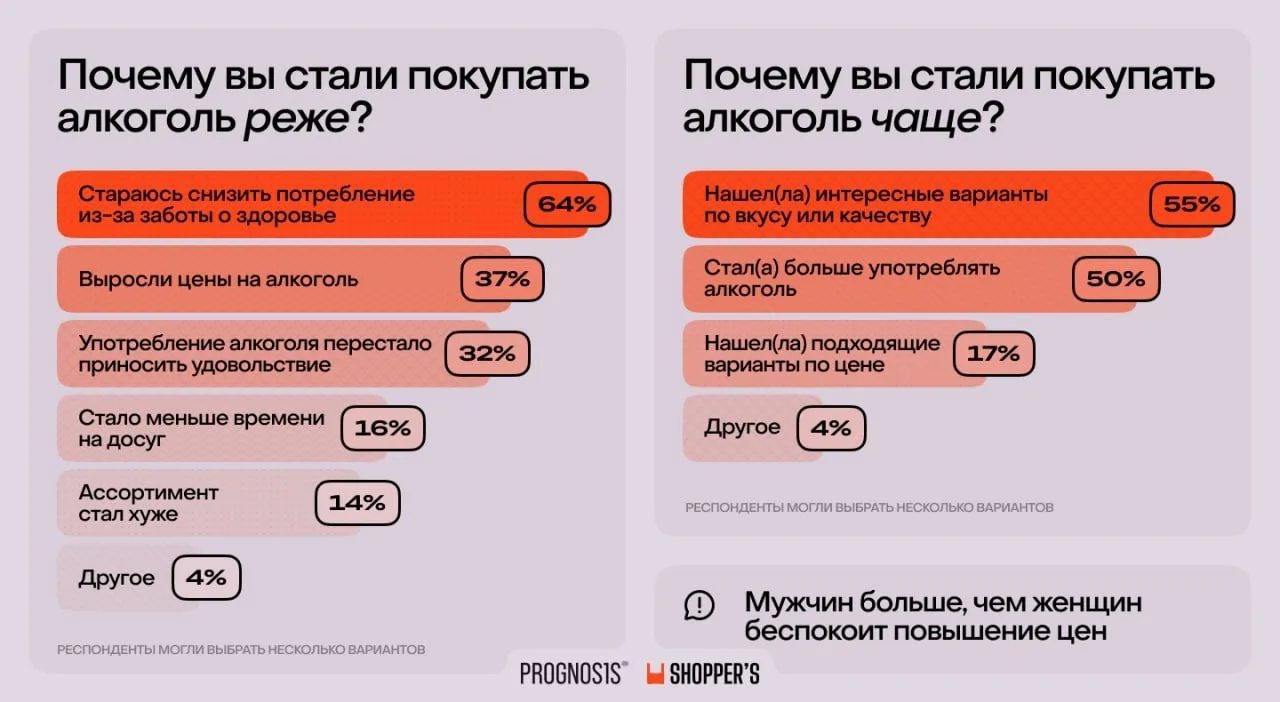 💸 У экономии на спиртном — мужское лицо. Мужчины чаще снижали потребление из-за выросшей цены, а на российский алкоголь переходили из-за его более низкой стоимости. Но и дорожали из-за роста акцизов сильнее всего «мужские» напитки — водка, виски и коньяк.