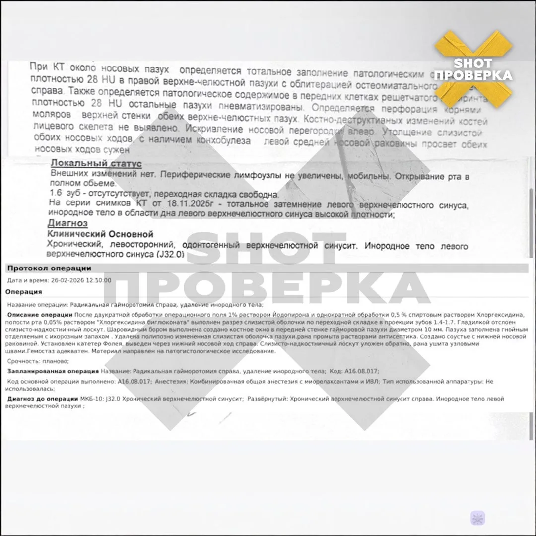 Как рассказали SHOT ПРОВЕРКЕ медики, без операции такой гайморит мог привести к серьёзным осложнениям: пневмонии из-за попадания гноя в лёгкие, разрушению верхней челюсти. Самое опасное последствие — распространение инфекции в полость черепа, что может вызвать менингит или абсцесс мозга с летальным исходом.