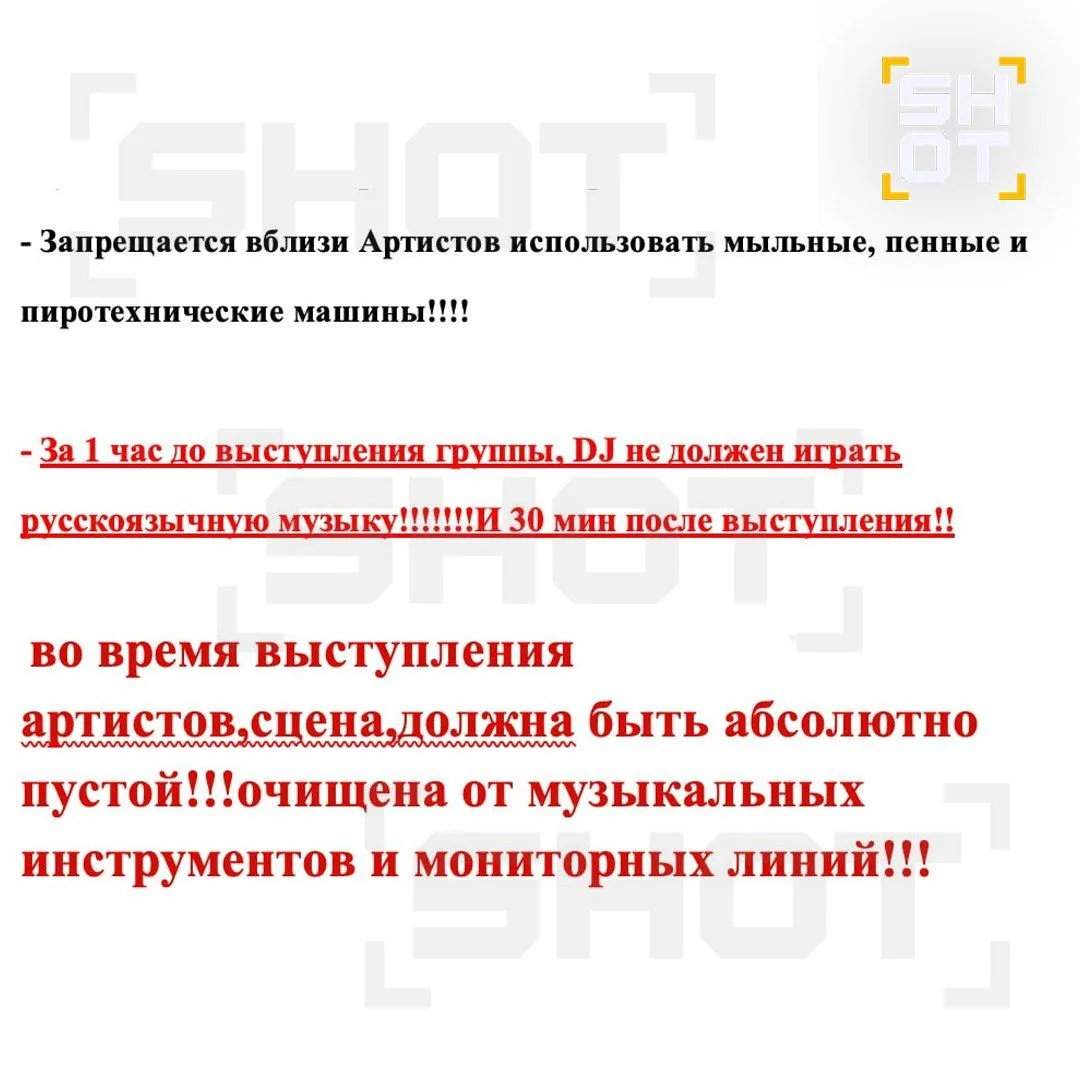 В условиях прописано, что диджей вечеринки не должен ставить русскоязычные треки за час до приезда и полчаса после отъезда артистов. В то же время Quest Pistols сами начинают шоу с хита «Я устал» на русском.