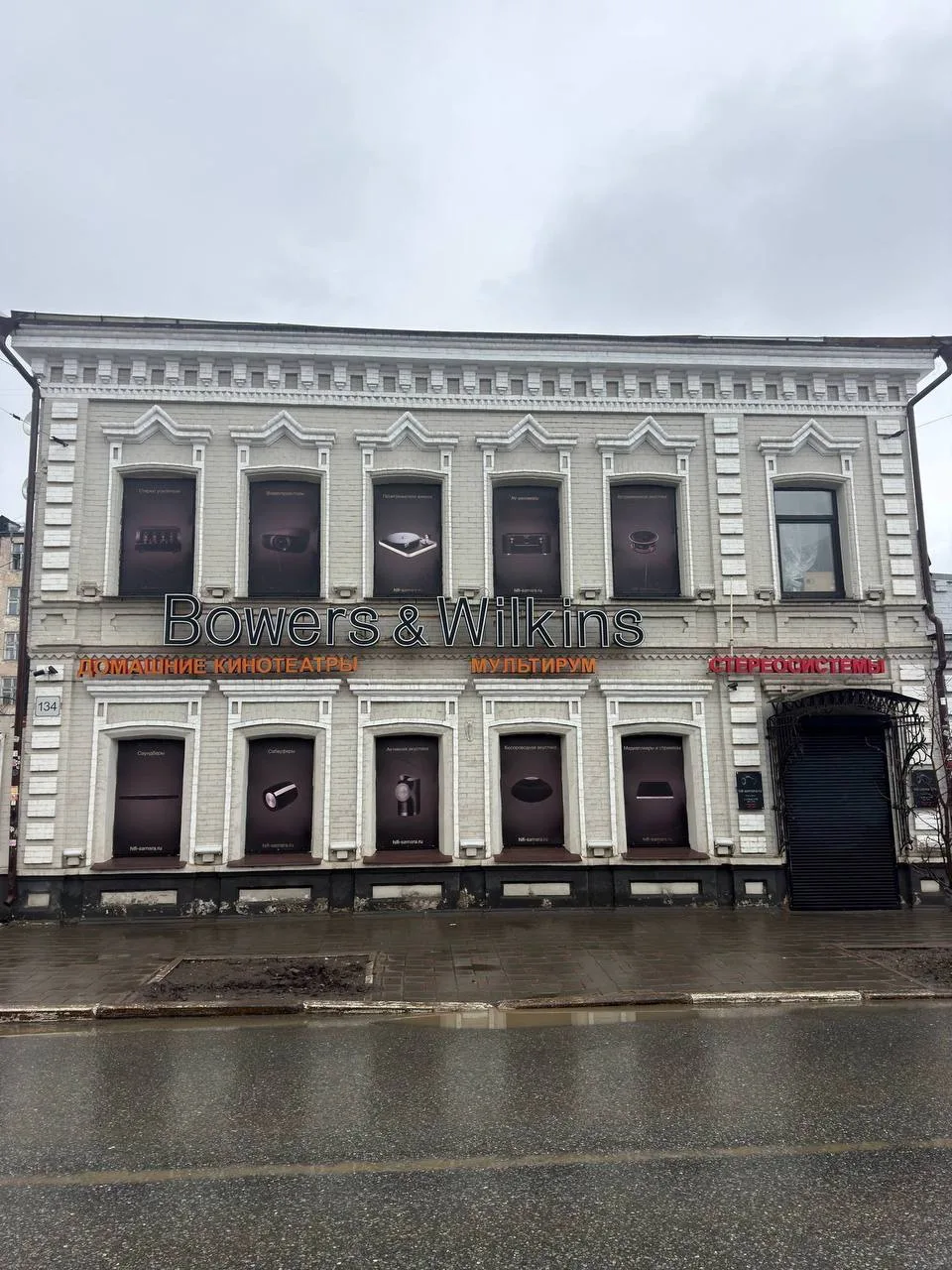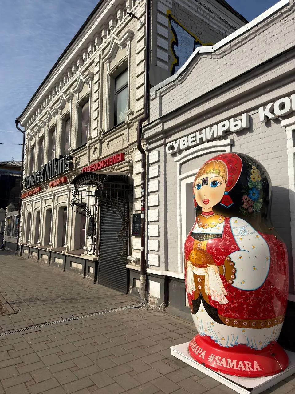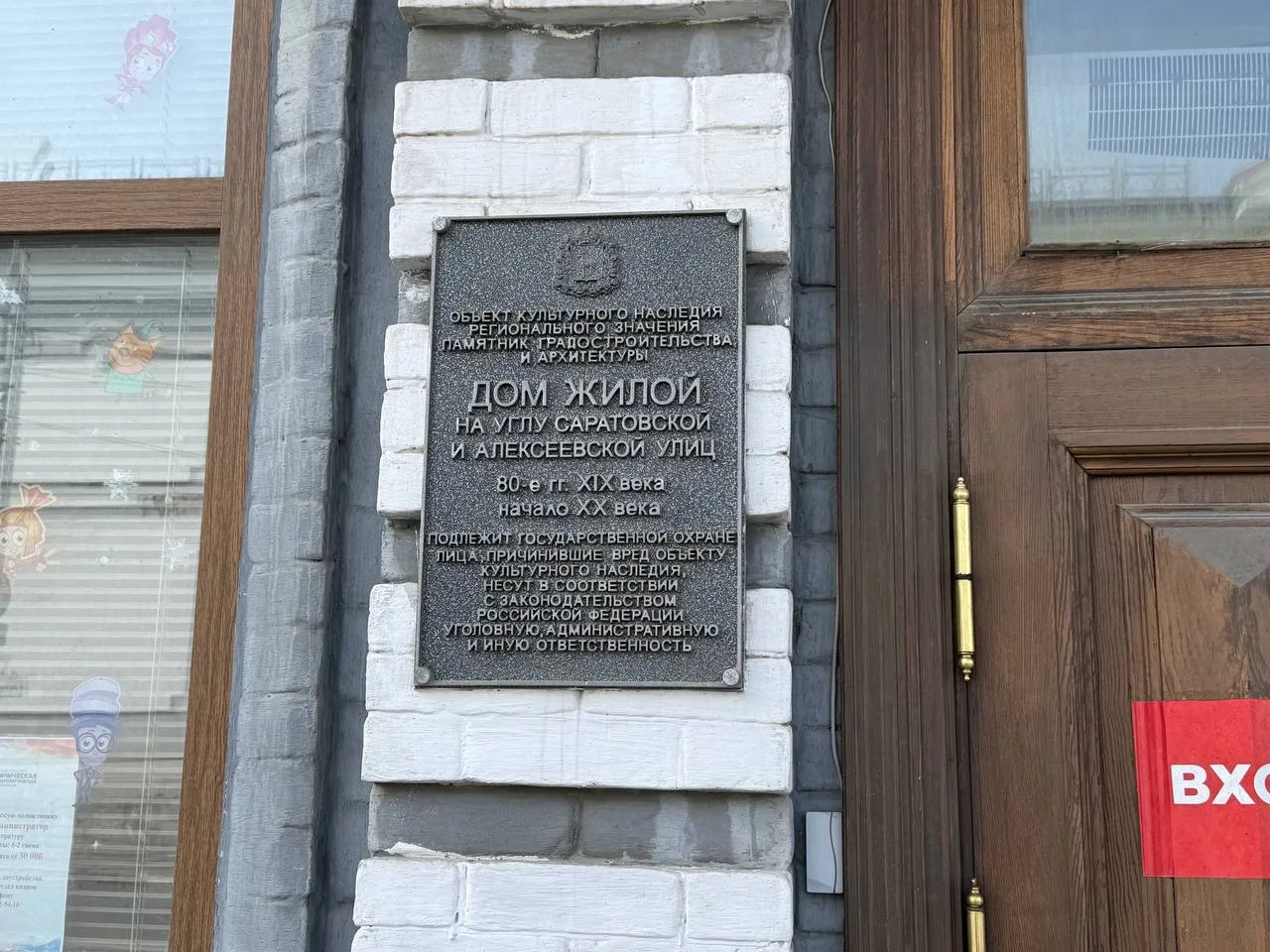 Живет женщина в доме — объекте культурного наследия и памятнике градостроительства и архитектуры, где с другой стороны расположена детская стоматология. К нему прилегает еще одно здание — по архитектуре и цветовой гамме такое же, я сначала даже подумала, что здание одно. Но нет, на прилегающем здании надпись на английском языке — реклама магазина (кстати, что там с законом о необходимости переводить надписи на русский?).