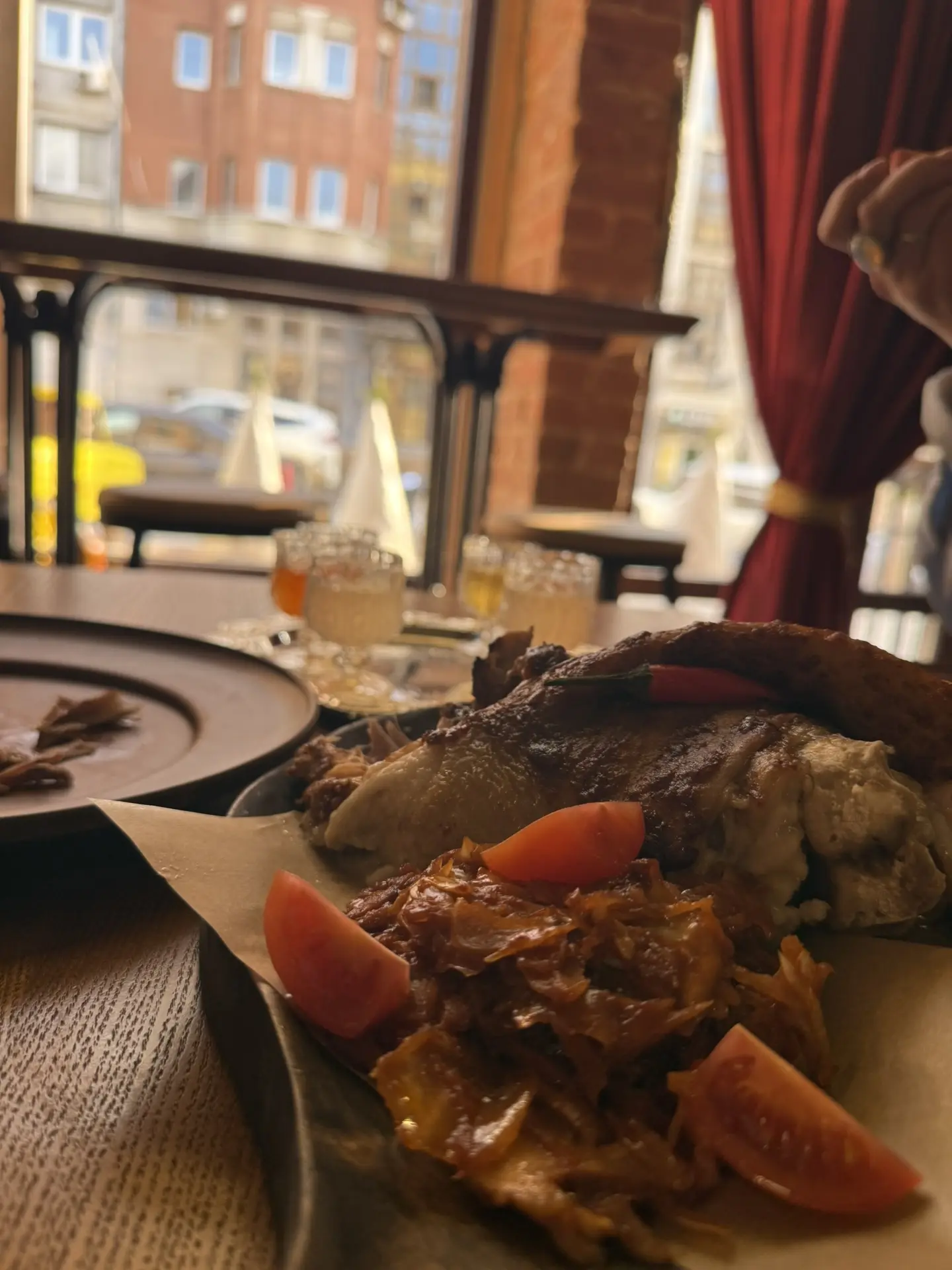 Если заказывать сидя на веранде, то подадут с видом на Волгу и местные достопримечательности. Пока не веранде прохладно, поэтому - с видом на каскад домов из разных эпох.