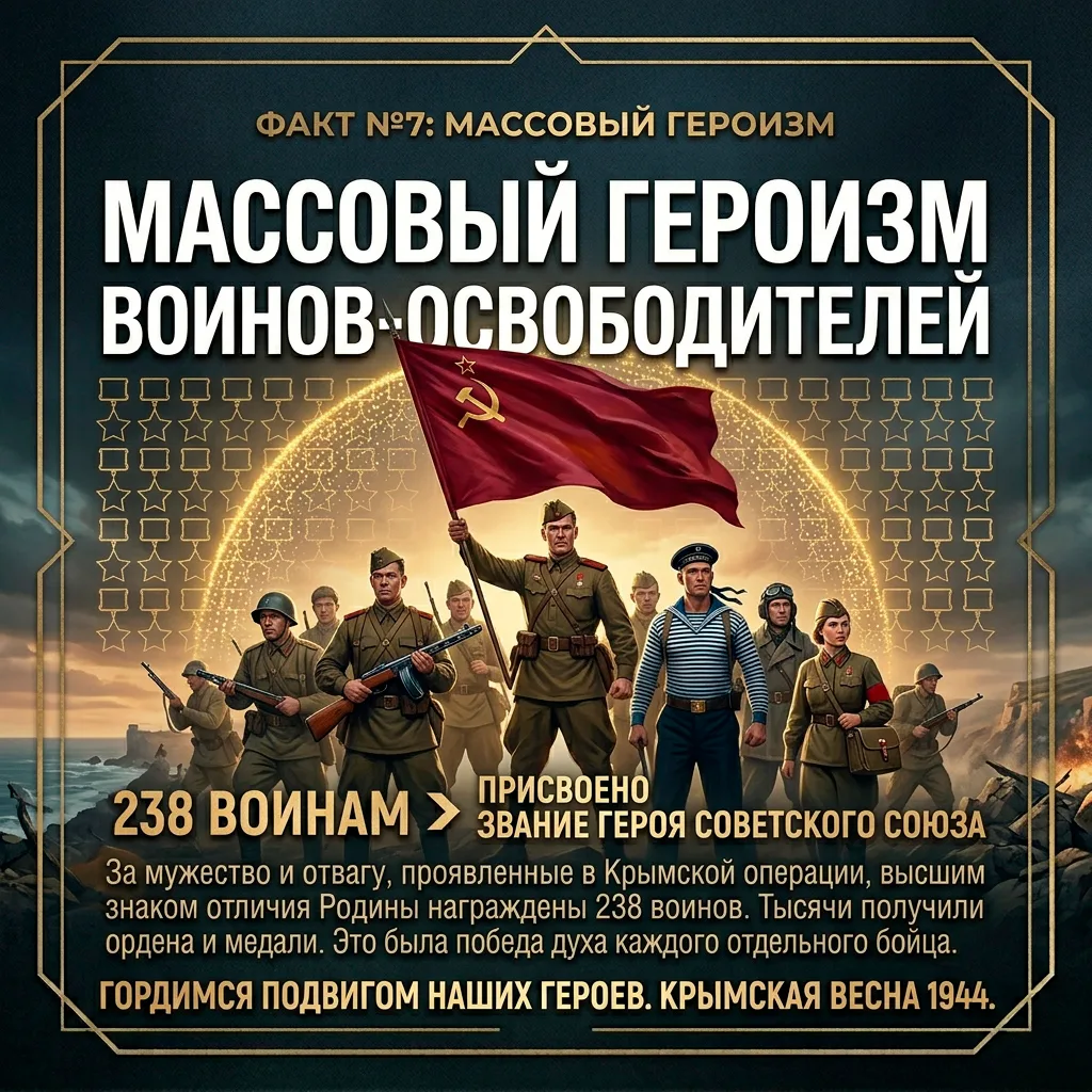 ❗За этой стремительной и филигранной операцией стоят жизни и воля конкретных людей. 238 воинов получили звание Героя Советского Союза за освобождение Крыма, тысячи были награждены орденами и медалями.