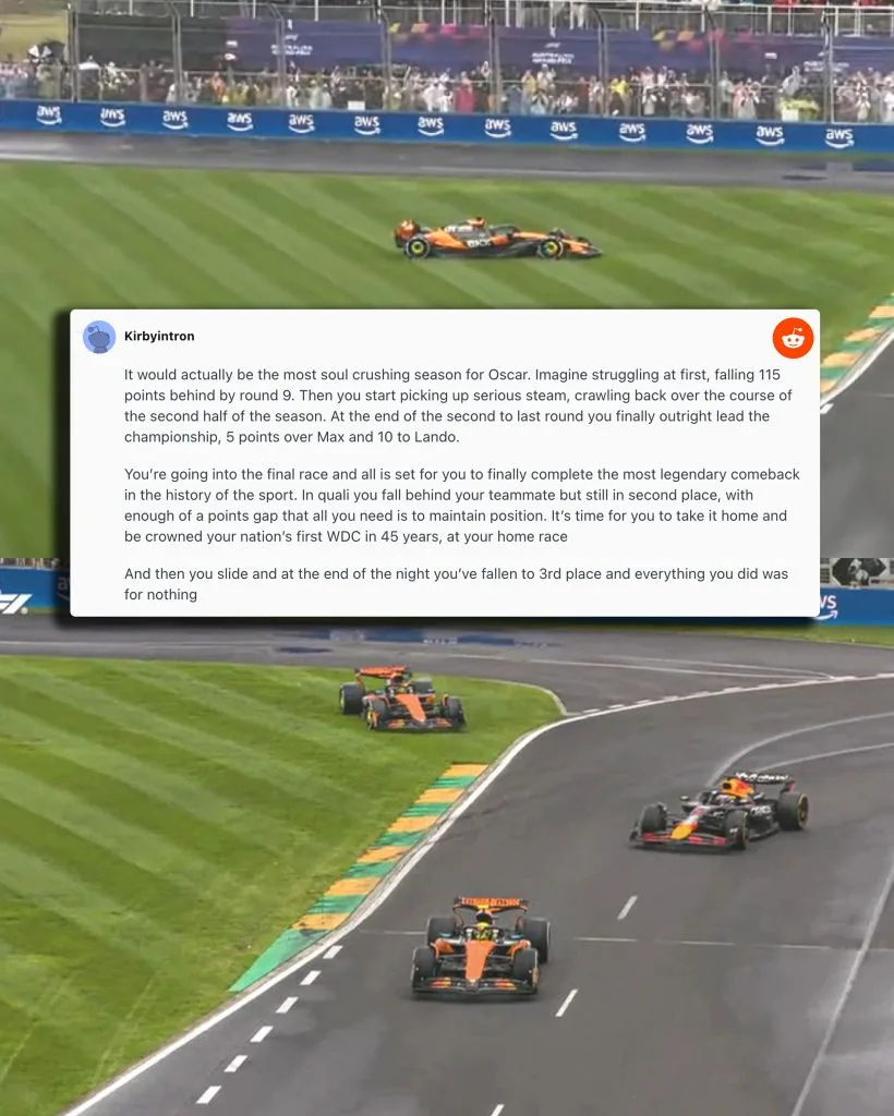 Но к финальному этапу в Австралии стал бы лидером, совершив мощный камбэк в Майами, Саудовской Аравии и Бахрейне. Он опережал бы на 5 очков Макса и на 10 Норриса.