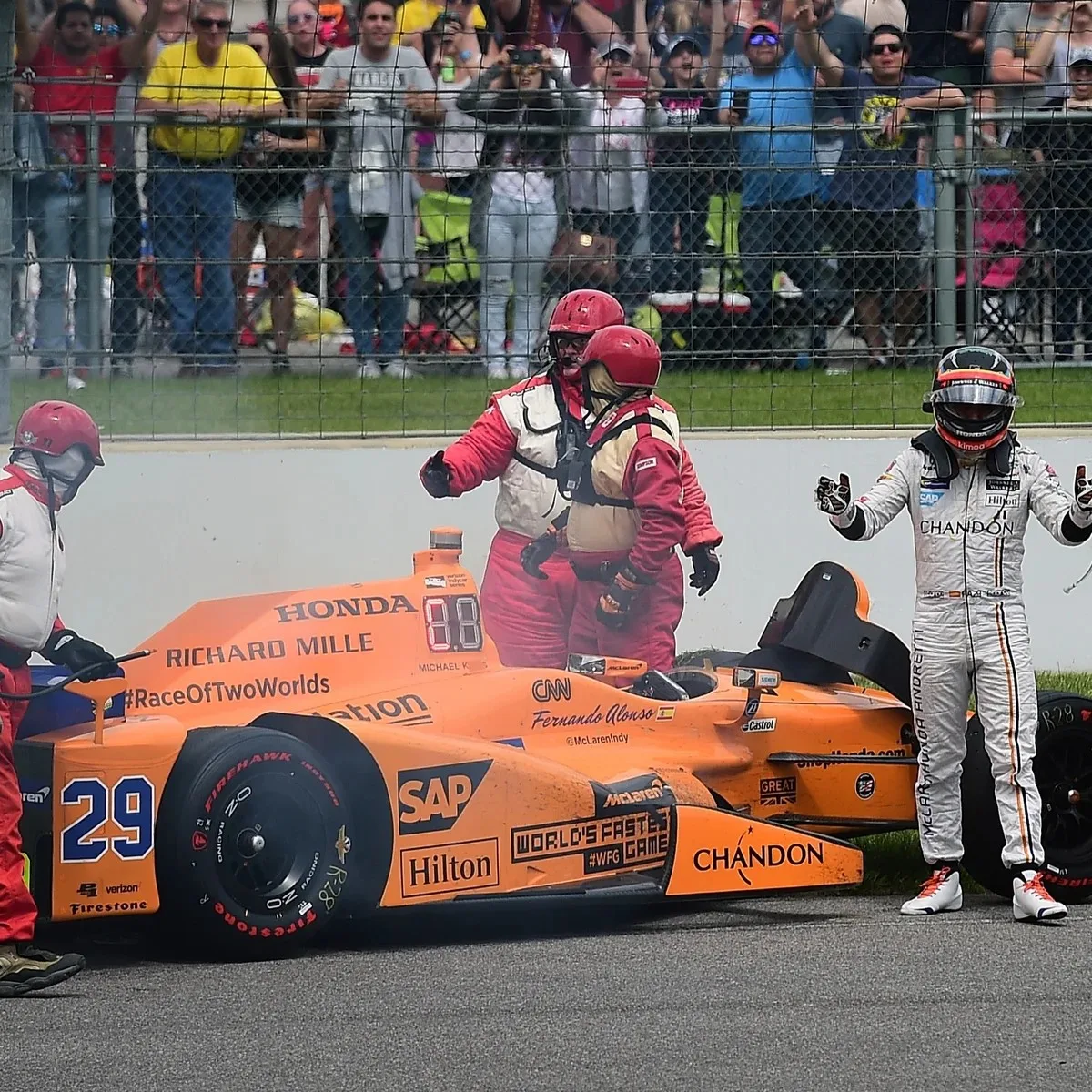 Алонсо в Австралии на 60 передаче когда двигатель Хонда показал 30000 оборотов и раздался звук горохового супа